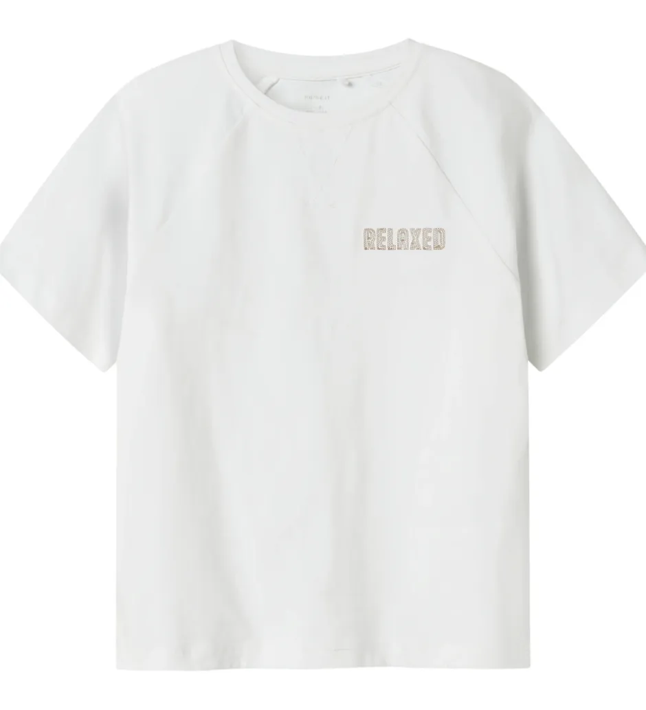 Flot Name It t-shirt i hvid med ordet “Relaxed” broderet i beige på venstre bryst. Name It t-shirten har en rund halsudskæring med en smal ribkant og korte ærmer.