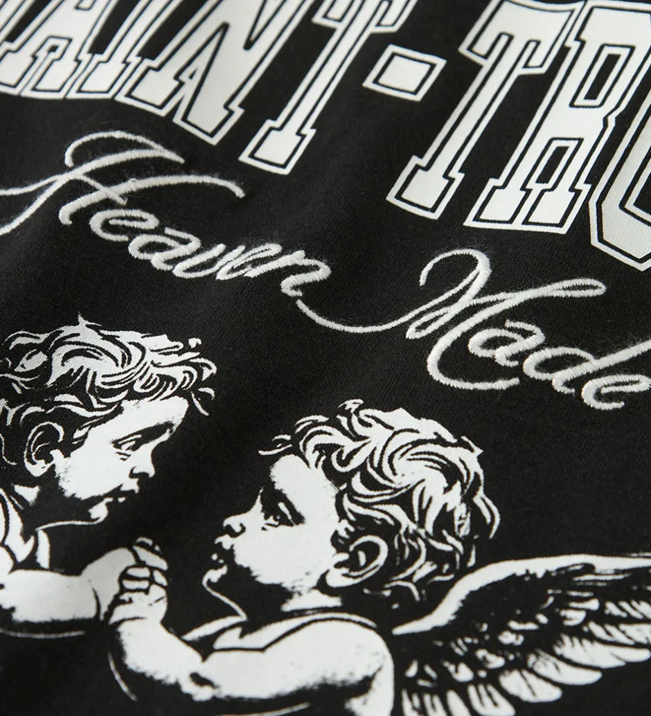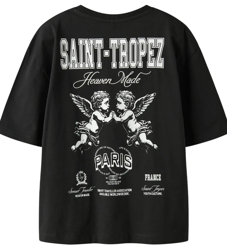 Stilfuld Name It t-shirt i klassisk sort med et hvidt tekst-print på brystet og bagsiden.