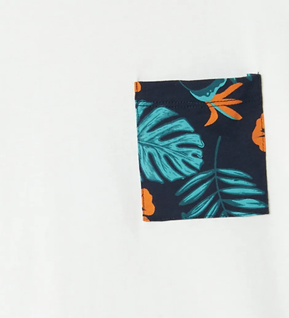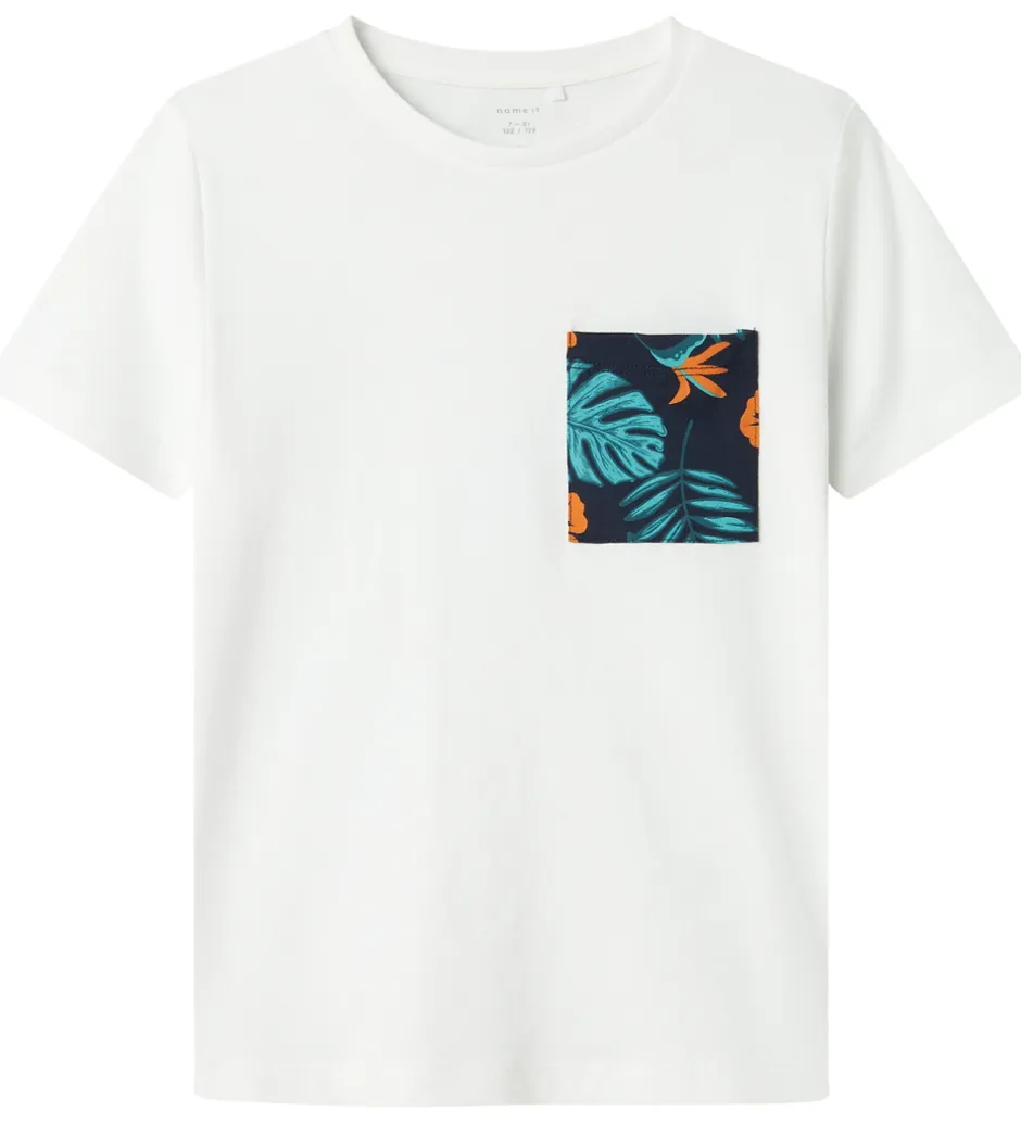 Flot Name It t-shirt i hvid med en lomme på venstre bryst med blomsterprint i navyblå, grøn og orange. Name It t-shirten har en rund halsudskæring med en smal ribkant og korte ærmer.