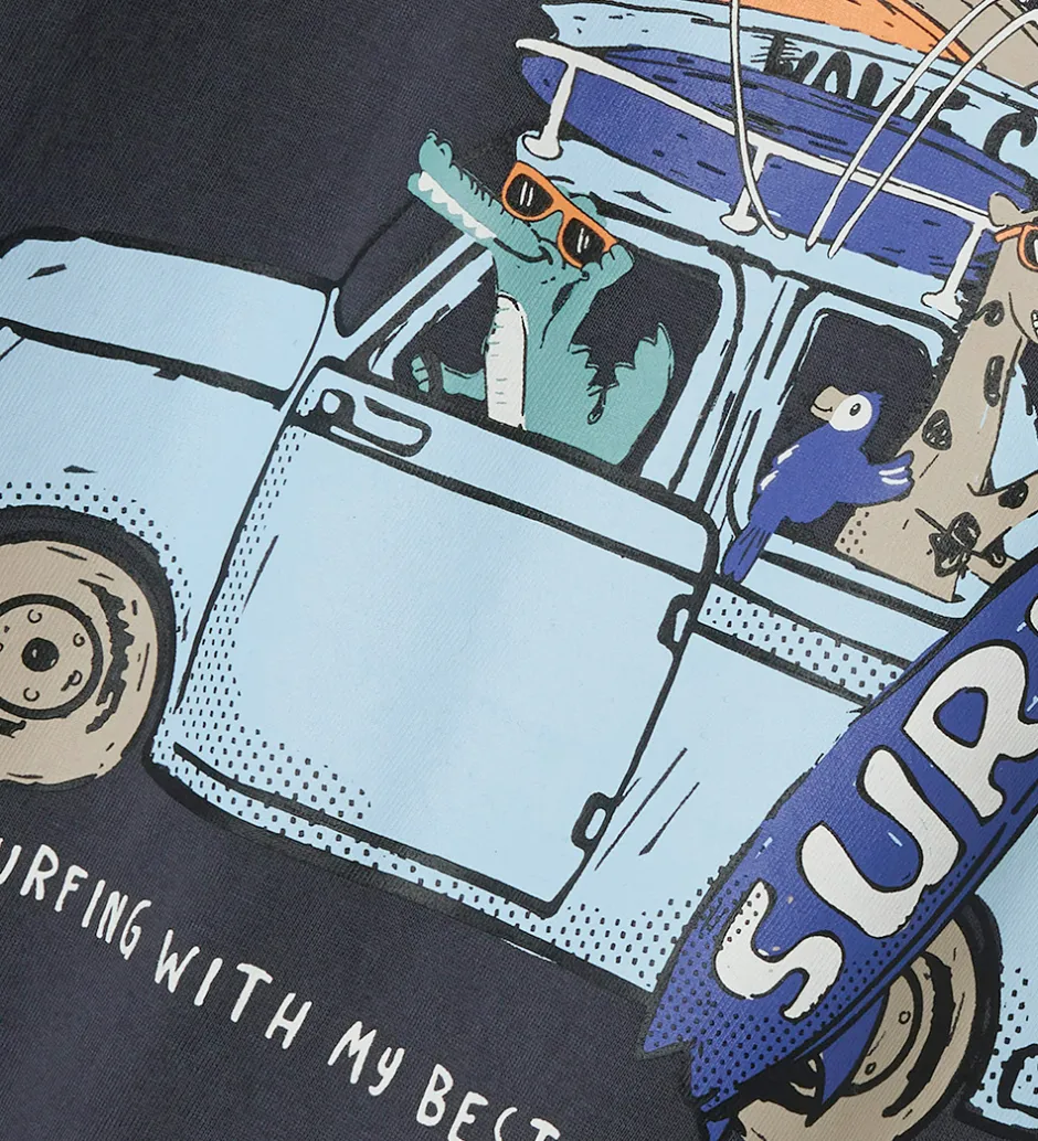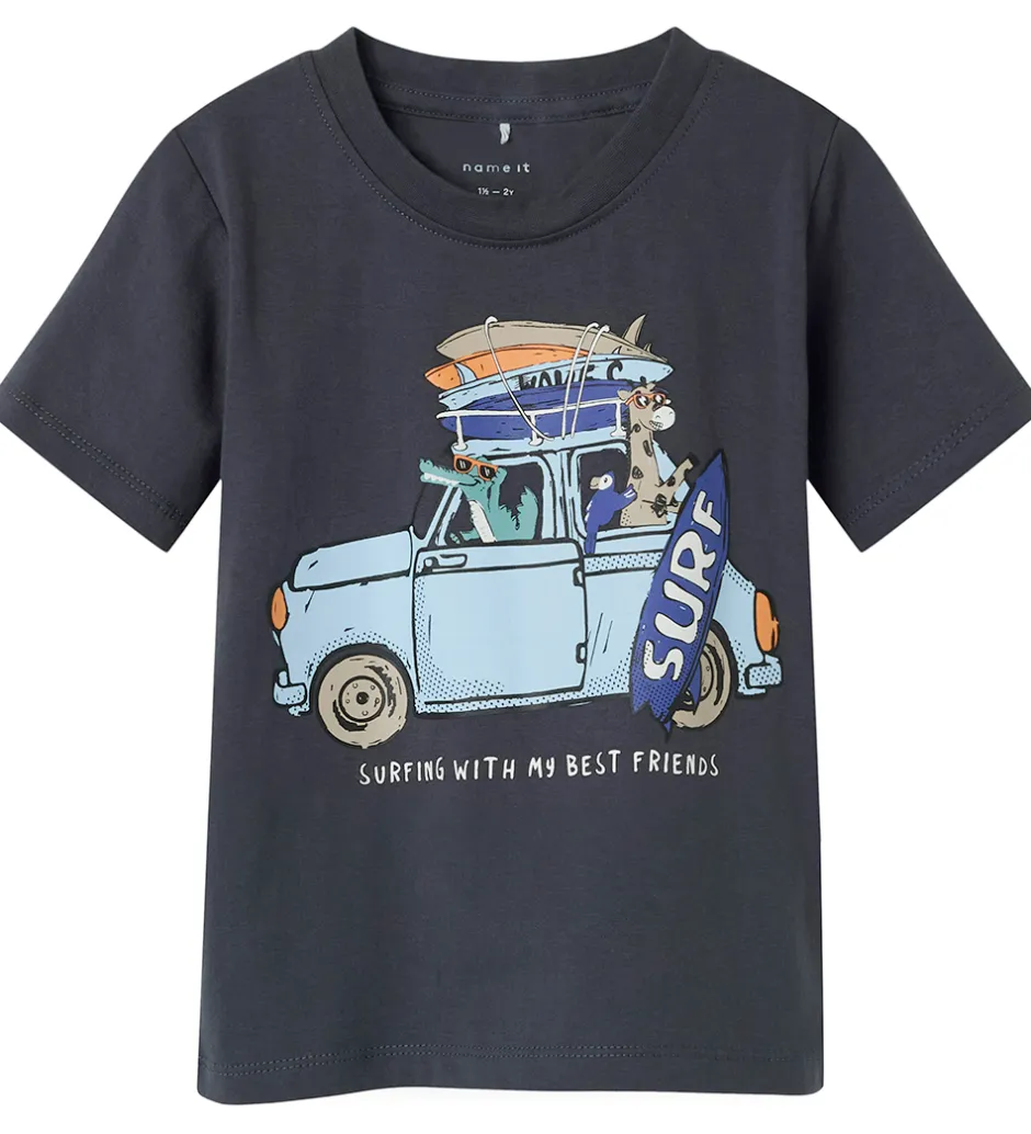 Charmerende Name It t-shirt i mørkegrå med et sjovt print med på fronten af en bil fyldt med glade dyr, klar til surfing. Name It t-shirten har en rund halsudskæring og korte ærmer.
