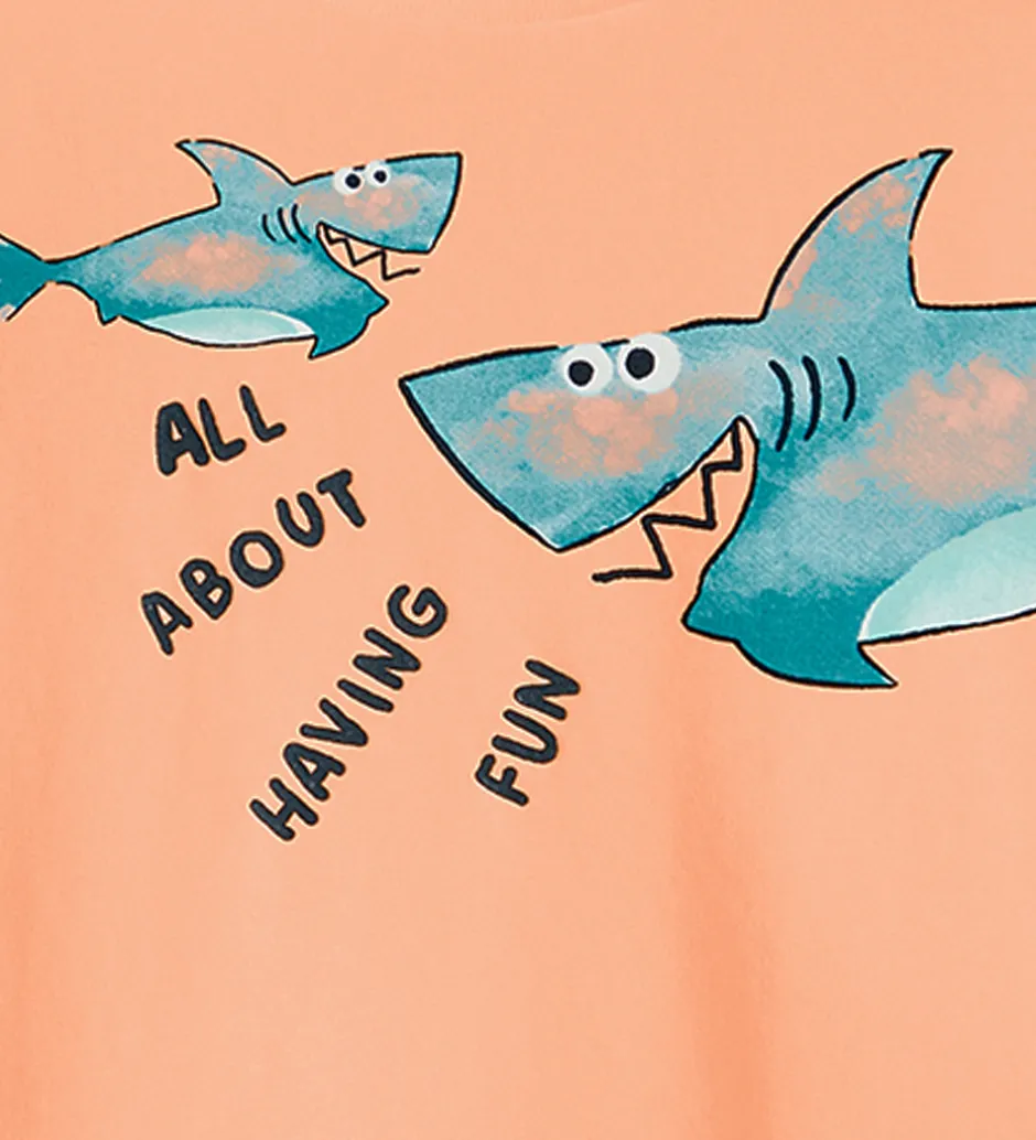 Smart Name It t-shirt i en frisk orange farve. T-shirten har et farverigt print af to sjove hajer med teksten “All About Having Fun”, hvilket skaber et livligt og underholdende udtryk. Name It t-shirten har en rund halsudskæring med en smal ribkant og korte ærmer.