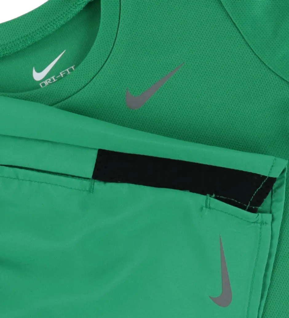 Smart Nike sæt, der består af et par shorts og en t-shirt i grøn med et lille refleksprint formet som et logo.