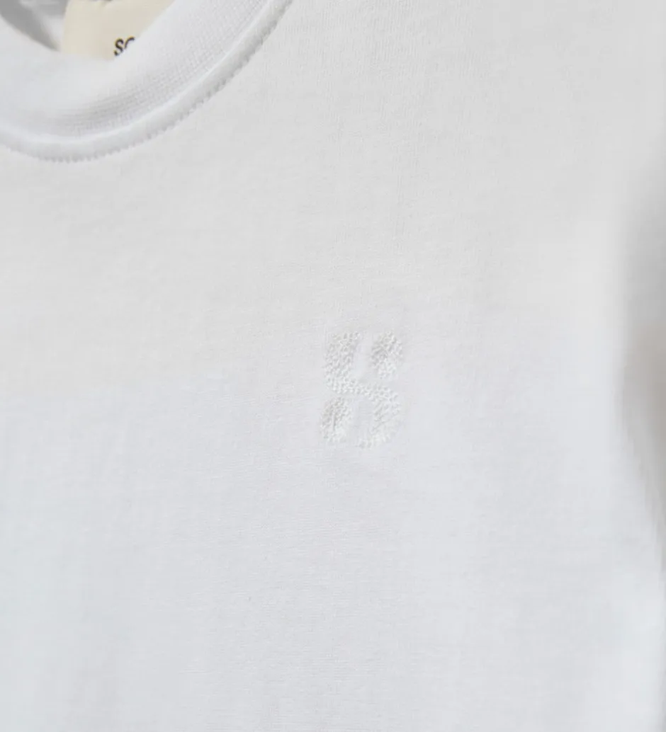Elegant Sofie Schnoor t-shirt i en enkel hvid nuance med et diskret broderet logo på venstre bryst. T-shirten er designet med korte ærmer og en klassisk rund halsudskæring. Den fremstår med et stilrent look, der er let at integrere i garderoben.
