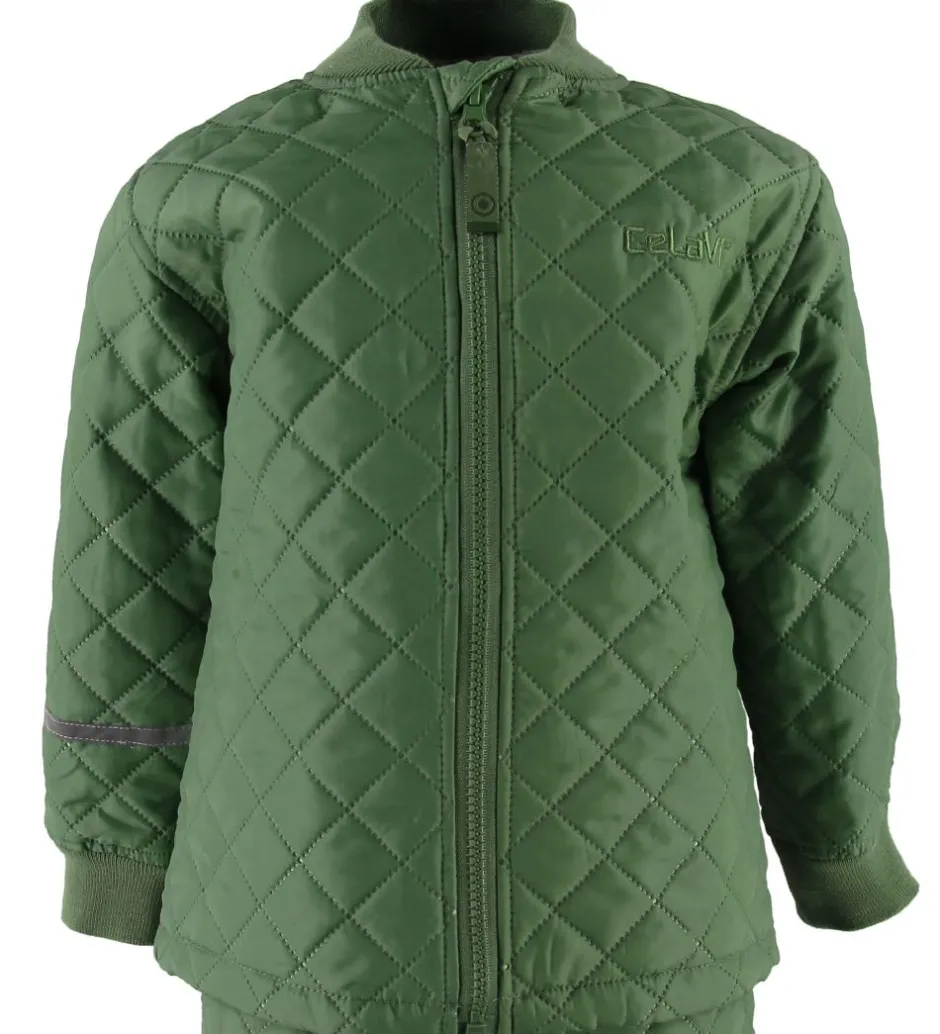 Flot CeLaVi termotøj i en armygrøn, og sættet består af en termojakke og et par termobukser. På jakken er navnet “CeLaVi” broderet øverst til venstre.