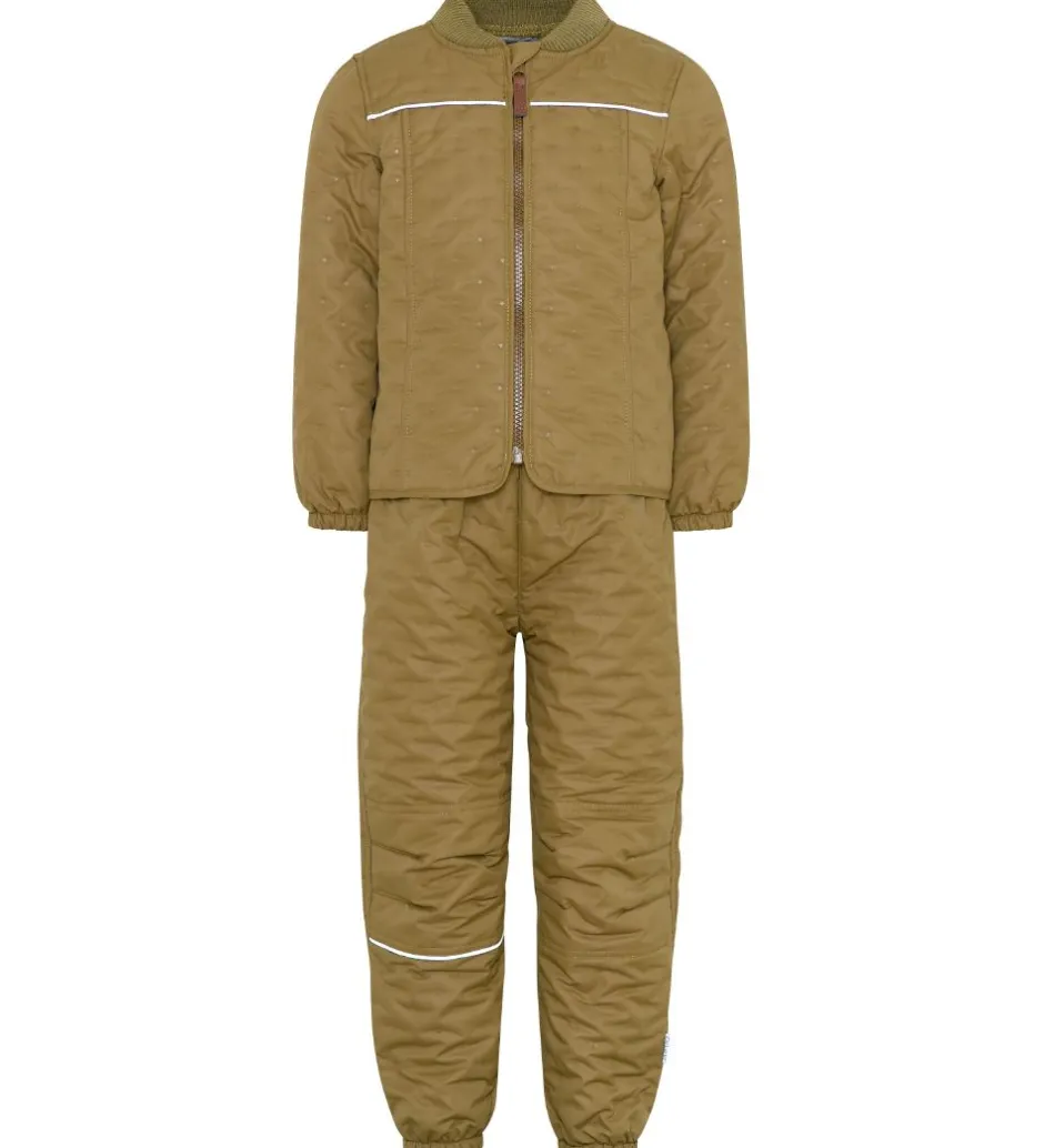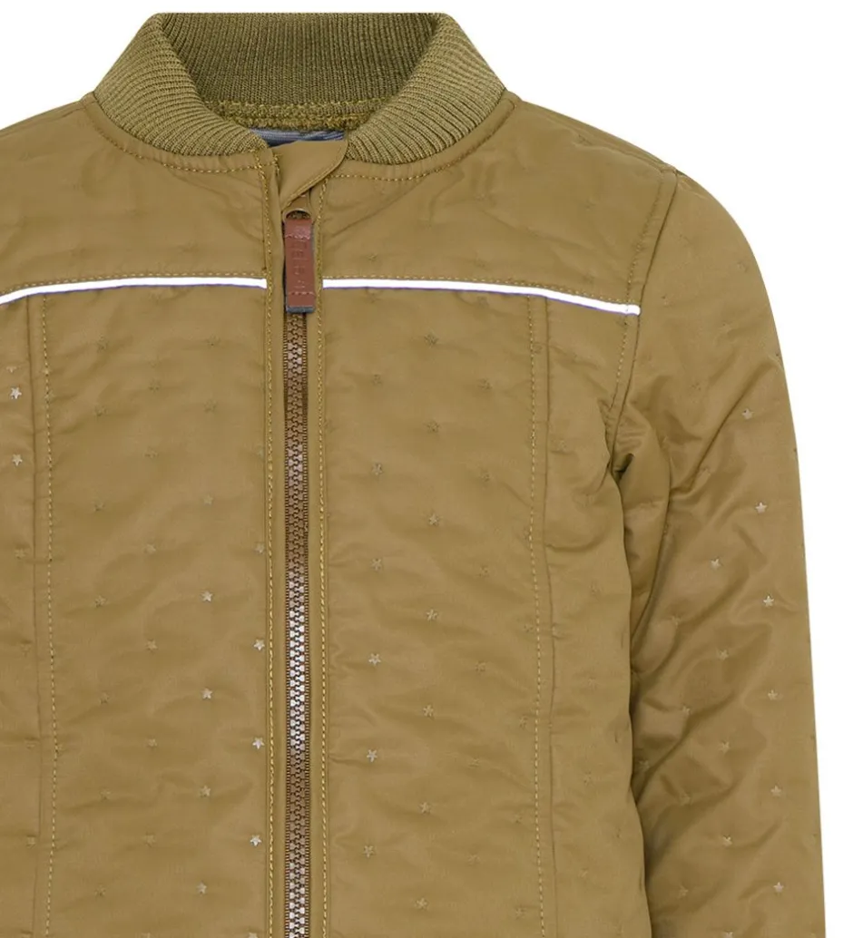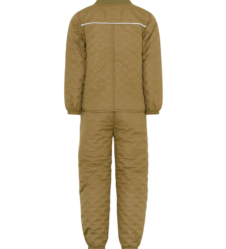 Fint CeLaVi termotøj bestående af en termojakke samt et par termobukser i støvet armygrøn. Termotøjet har et prikmønster af små stjerner, som er præget ind i termotøjets stof og giver det en quiltet struktur.