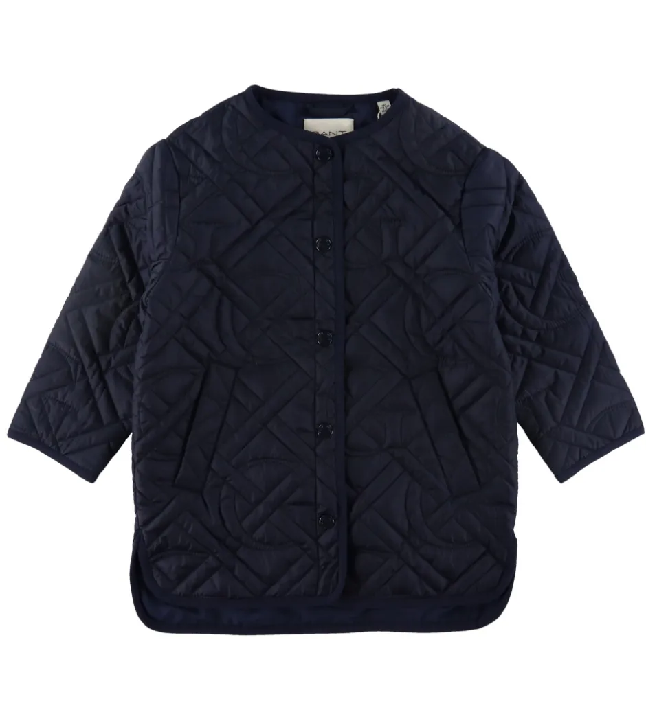 Lækker GANT termofrakke i navyblå med en quiltet struktur med brandets velkendte “G”.