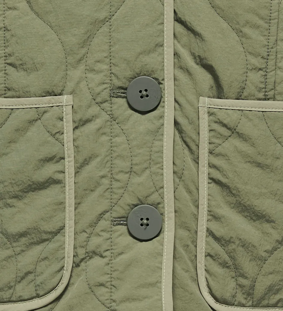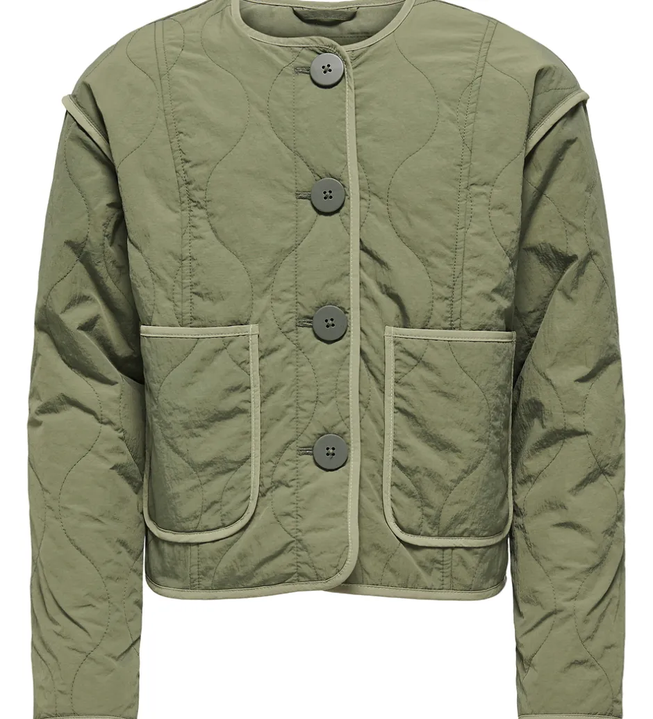 Flot Kids Only termojakke i olivengrøn med quiltet struktur og kanter i en lysere grøn nuance. Termojakken har en rund halsudskæring og lange ærmer. Den lukkes fortil med gennemgående knapper, og har en stor lomme i hver side. Termojakken har en let vattering og glat for indvendigt.