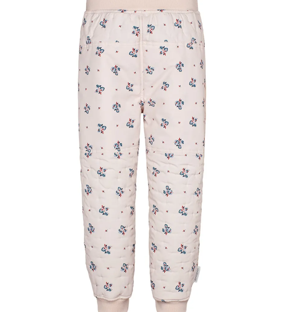Skønne MarMar termobukser i beige med et rosa skær og et flot alloverblomsterprint med blå og røde nuancer. Termobukserne har en quiltet struktur af små, indprægede prikker.