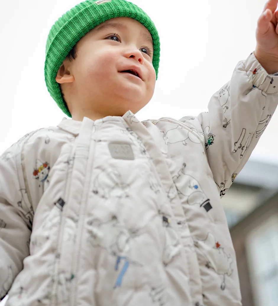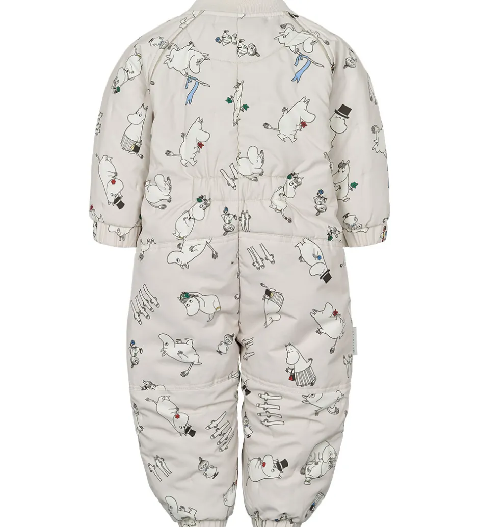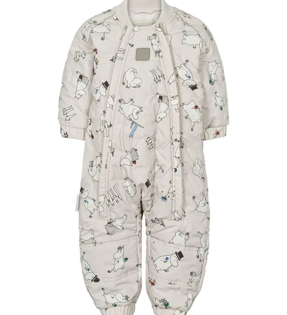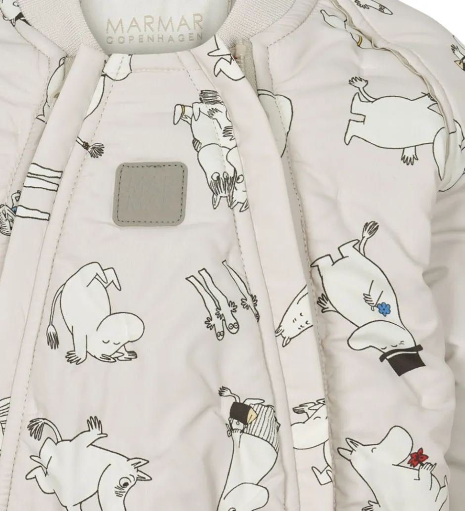 Fin MarMar termodragt i lys beige med alloverprint med de søde Mumitrolde og motiver fra Mumidalen. Termodragten har en quiltet struktur af små, indprægede prikker og en logopatch fortil.