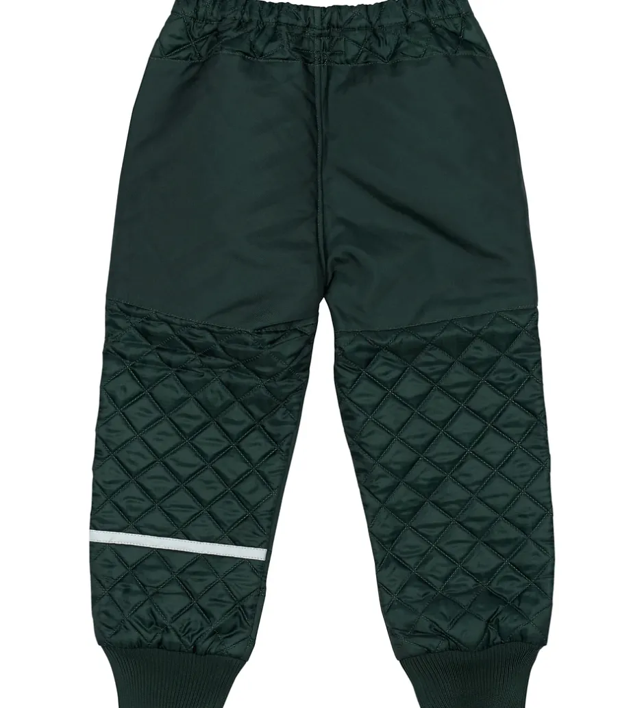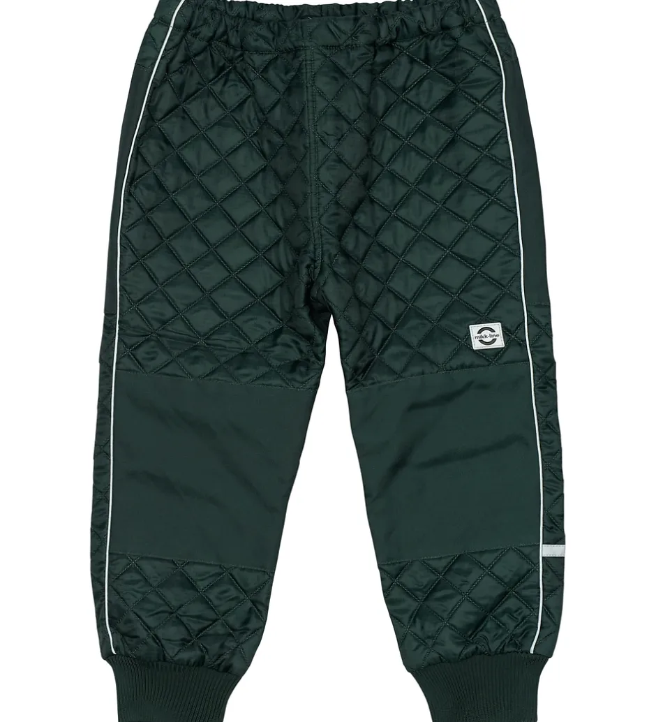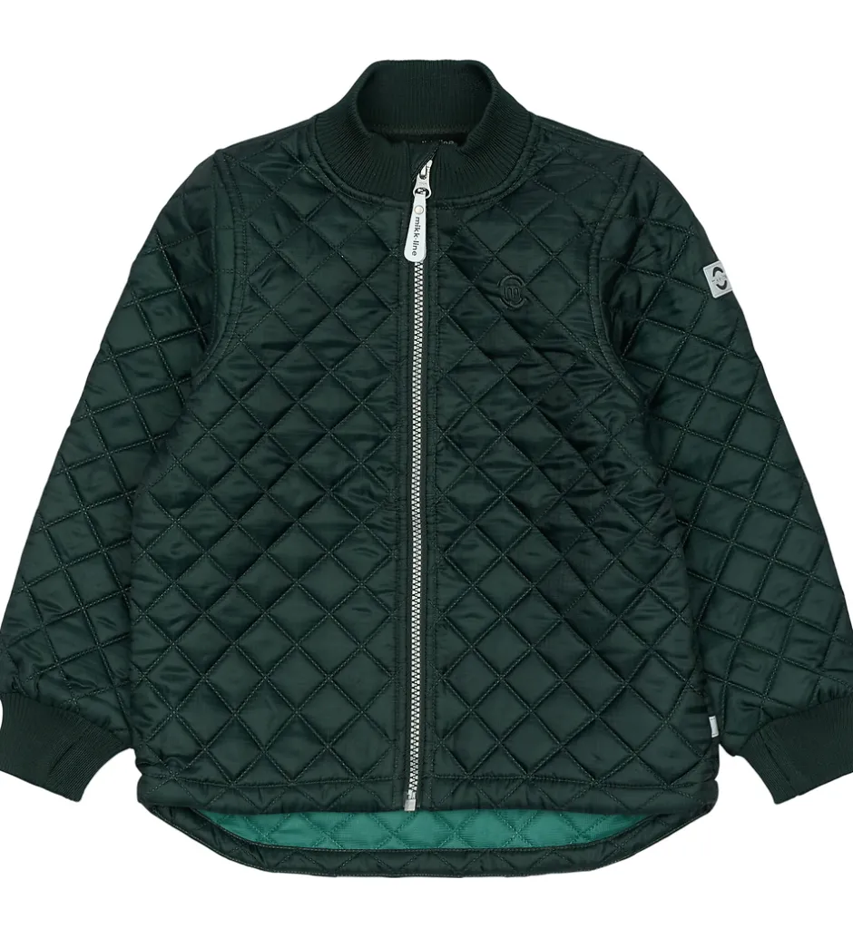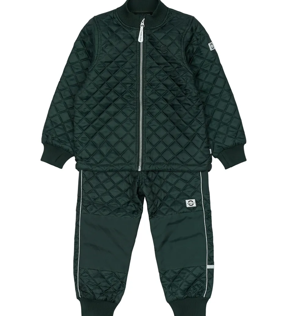 Fint Mikk-Line termotøj bestående af en termojakke og et par termobukser i mørkegrøn med en quiltet struktur.