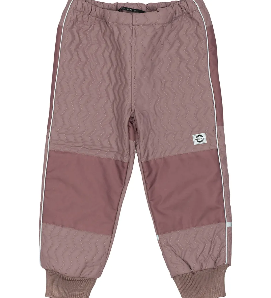 Mikk-Line termobukserne har en smal, justerbar elastik i livet, og buksebenene har brede ribkanter. På numsen og knæene er der praktiske forstærkninger. Både termobukserne og termojakken har praktiske reflekser.