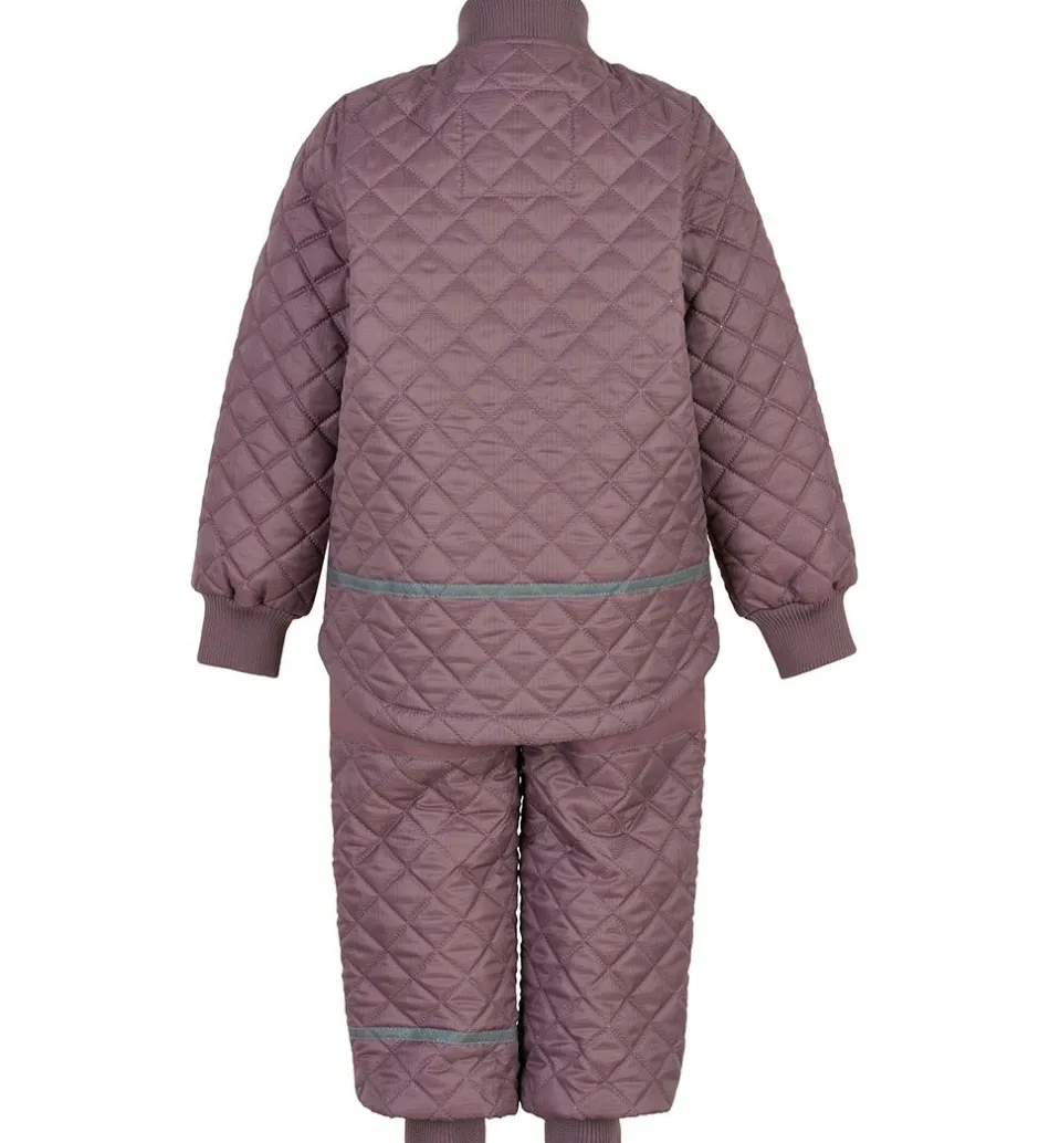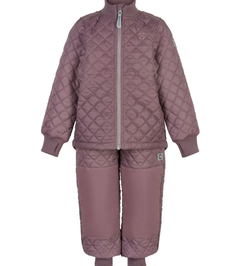 Fint Mikk-Line termotøj bestående af en termojakke og et par termobukser i støvet rosa i en glatvævet kvalitet og med en quiltet struktur.