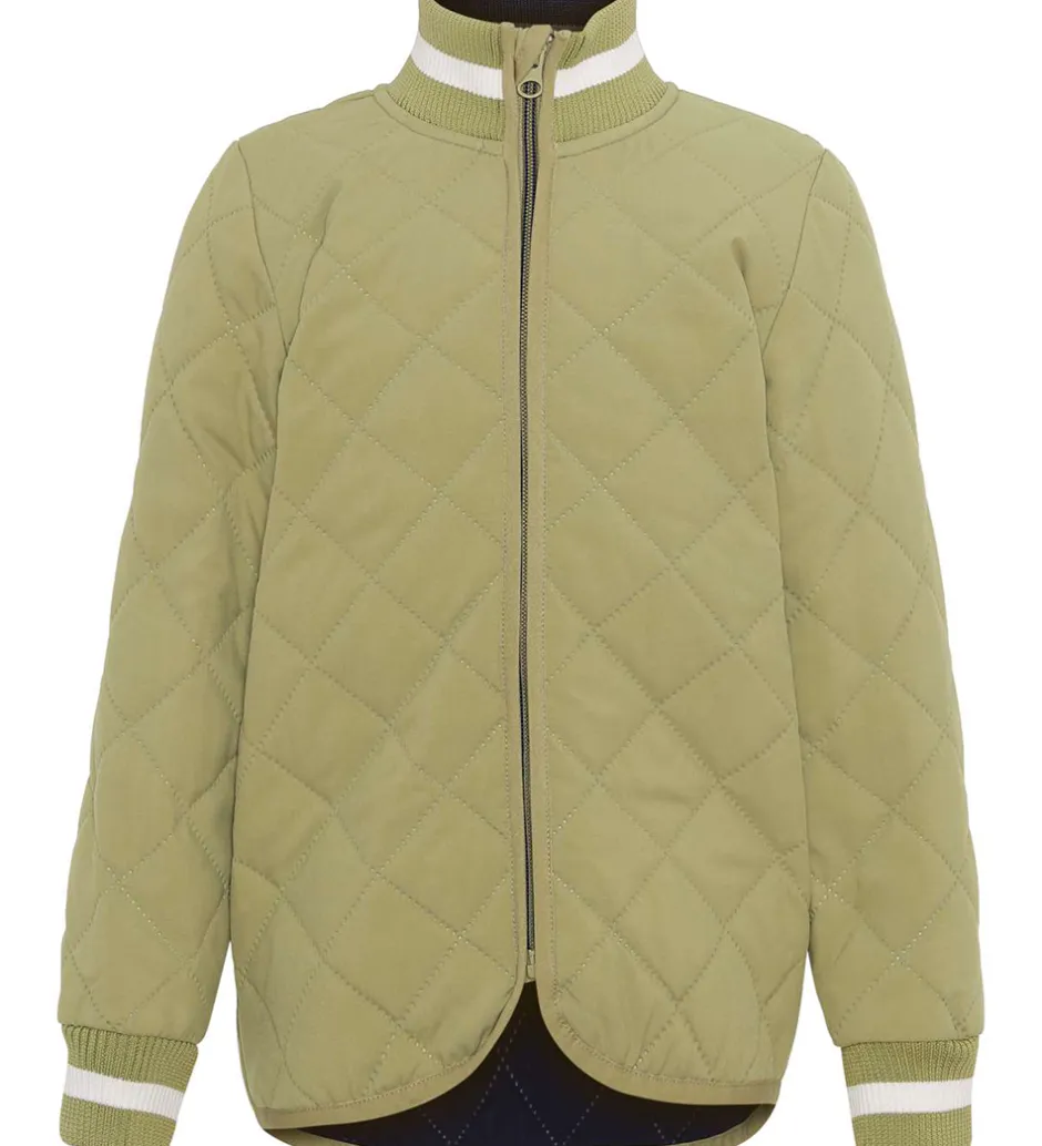 Dejlig Molo termojakke i støvet grøn med et quiltet mønster og med hvide striber på ribkanterne. Indvendigt er der et sort for.
