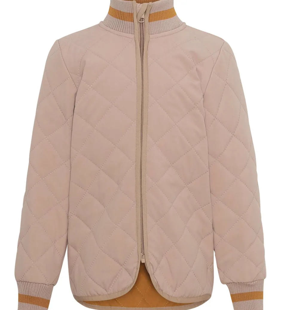 Dejlig Molo termojakke i rosa med et quiltet mønster og med gyldenbrune striber på ribkanterne. Indvendigt er der et gyldenbrunt for.