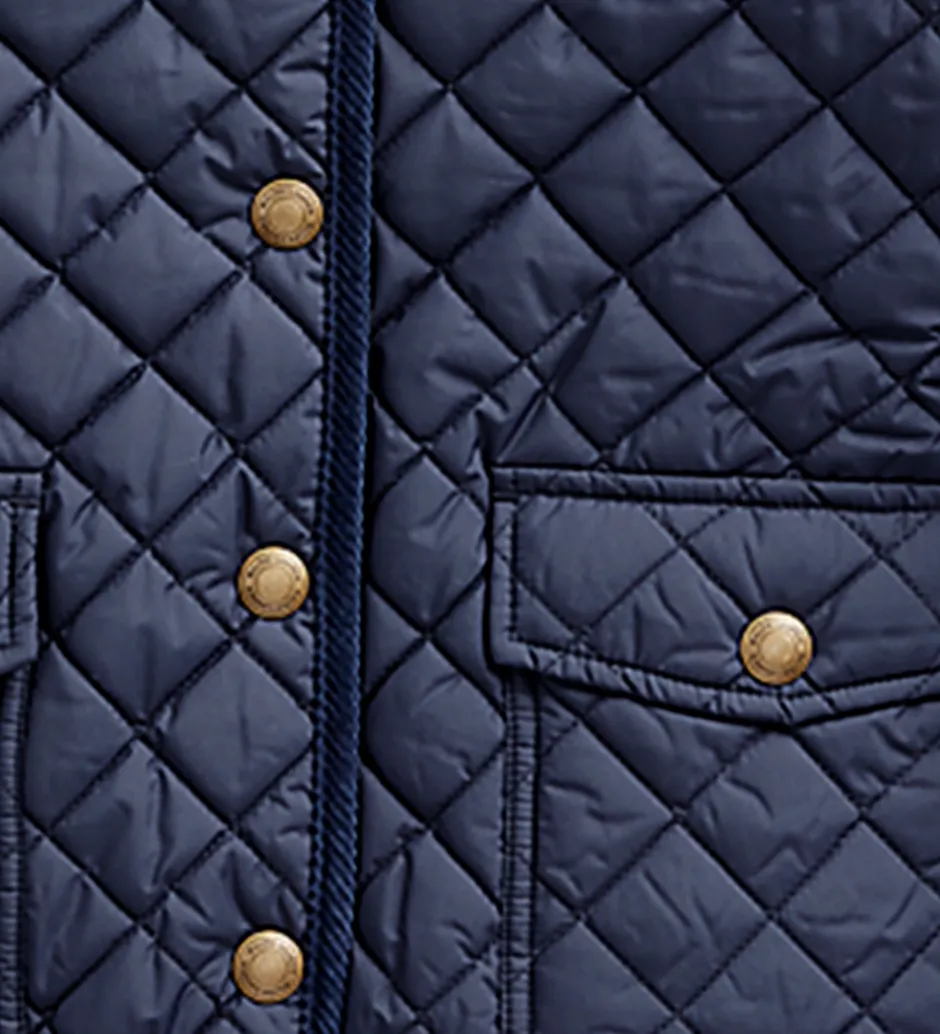 Polo Ralph Lauren termojakken har en aftagelig hætte, som sidder fast med skjulte knapper. I halsåbningen er der en klassisk krave af fløjl. Jakken har smalle kanter af fløjl, og ærmekanterne kan strammes ind med en trykknap.