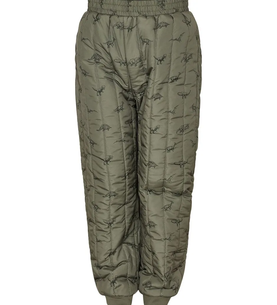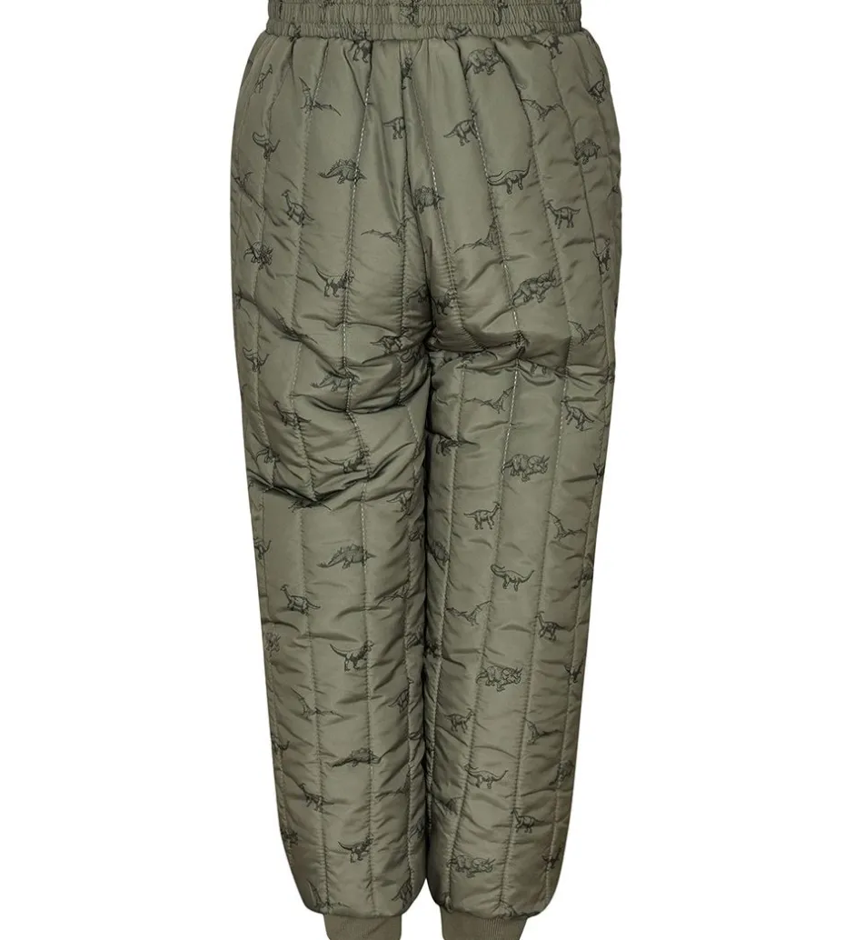 Fine Petit by Sofie Schnoor termobukser i armygrøn med et alloverdinosaurprint med en quiltet struktur.