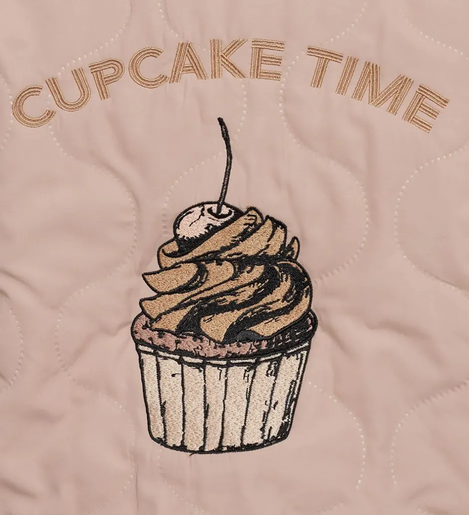 Skøn Petit by Sofie Schnoor termojakke i rosa med en broderet cupcake og teksten “CUPCAKE TIME” på ryggen. Termojakken er med en bølgende, quiltet struktur.