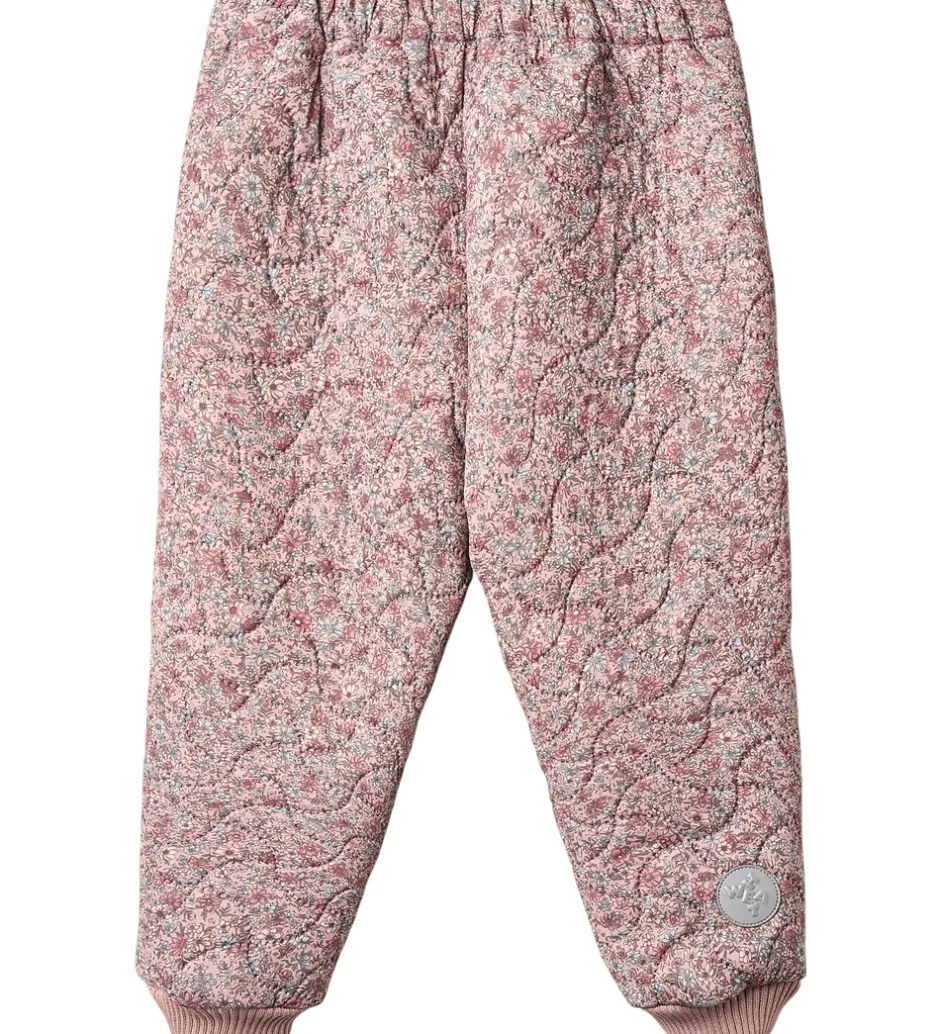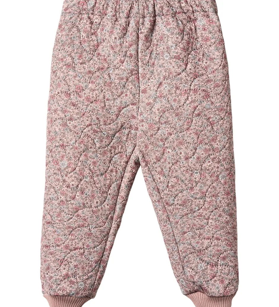 Fine Wheat termobukser i rosa med et alloverblomsterprint i lyseblå, grønne, hvide og rosa nuancer. Termobukserne har en bølgende, quiltet struktur.