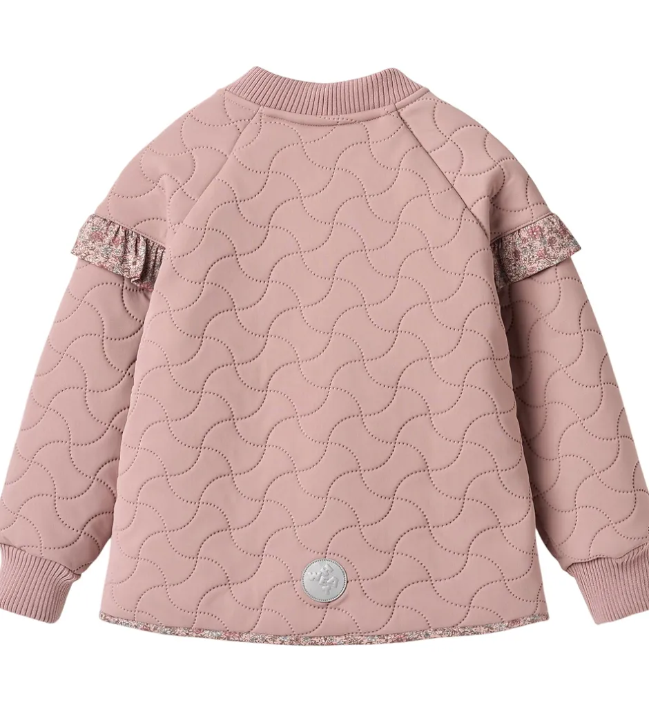 Smuk Wheat termojakke i varm rosa og småblomstrede skuldre, flæseskuldre og kanter i lyseblå, grønne, hvide og rosa nuancer. Termojakken har en quiltet struktur.