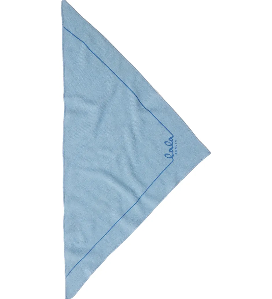 Fint Lala Berlin tørklæde i lyseblå med en smal stribe i blå hele vejen rundt langs kanten, og ved spidsen står der “Lala Berlin”.