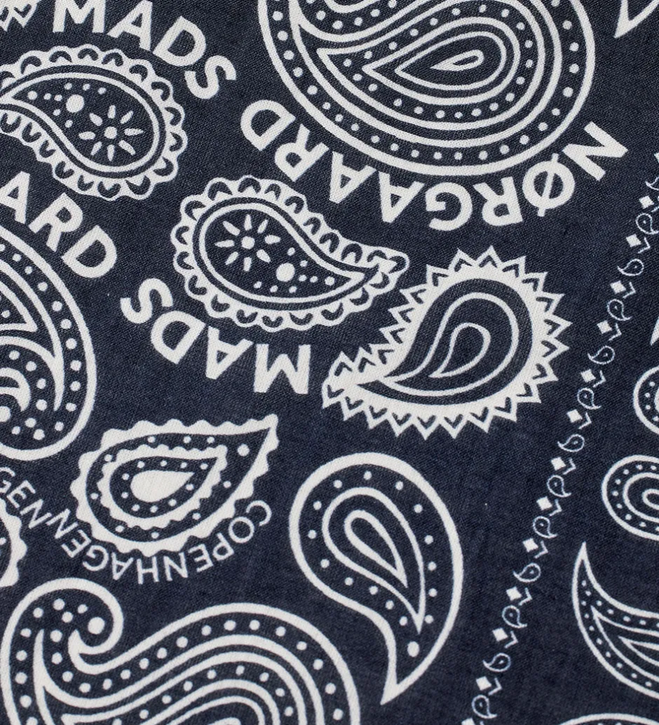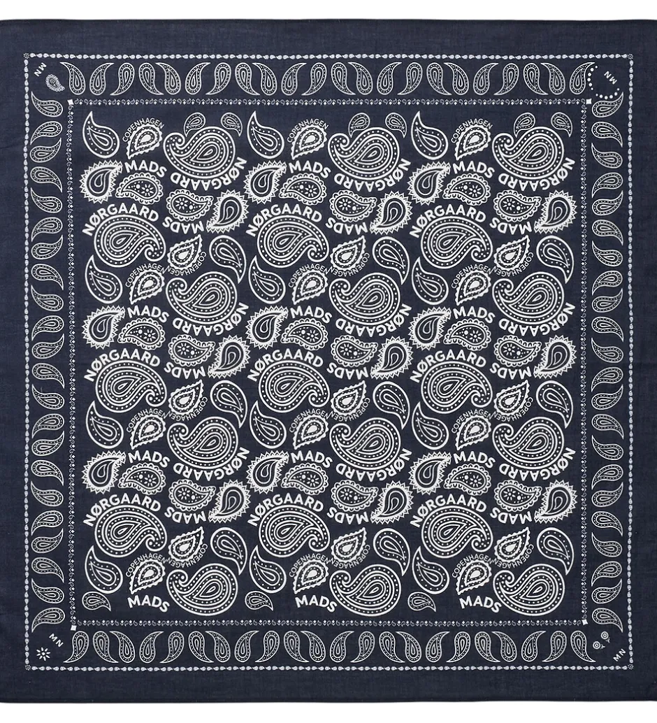 Flot Mads Nørgaard tørklæde i en dyb marineblå nuance med et indbydende paisley-print og det ikoniske logoprint i hvid. Mads Nørgaard skaber her et stilrent look, der passer til mange lejligheder.