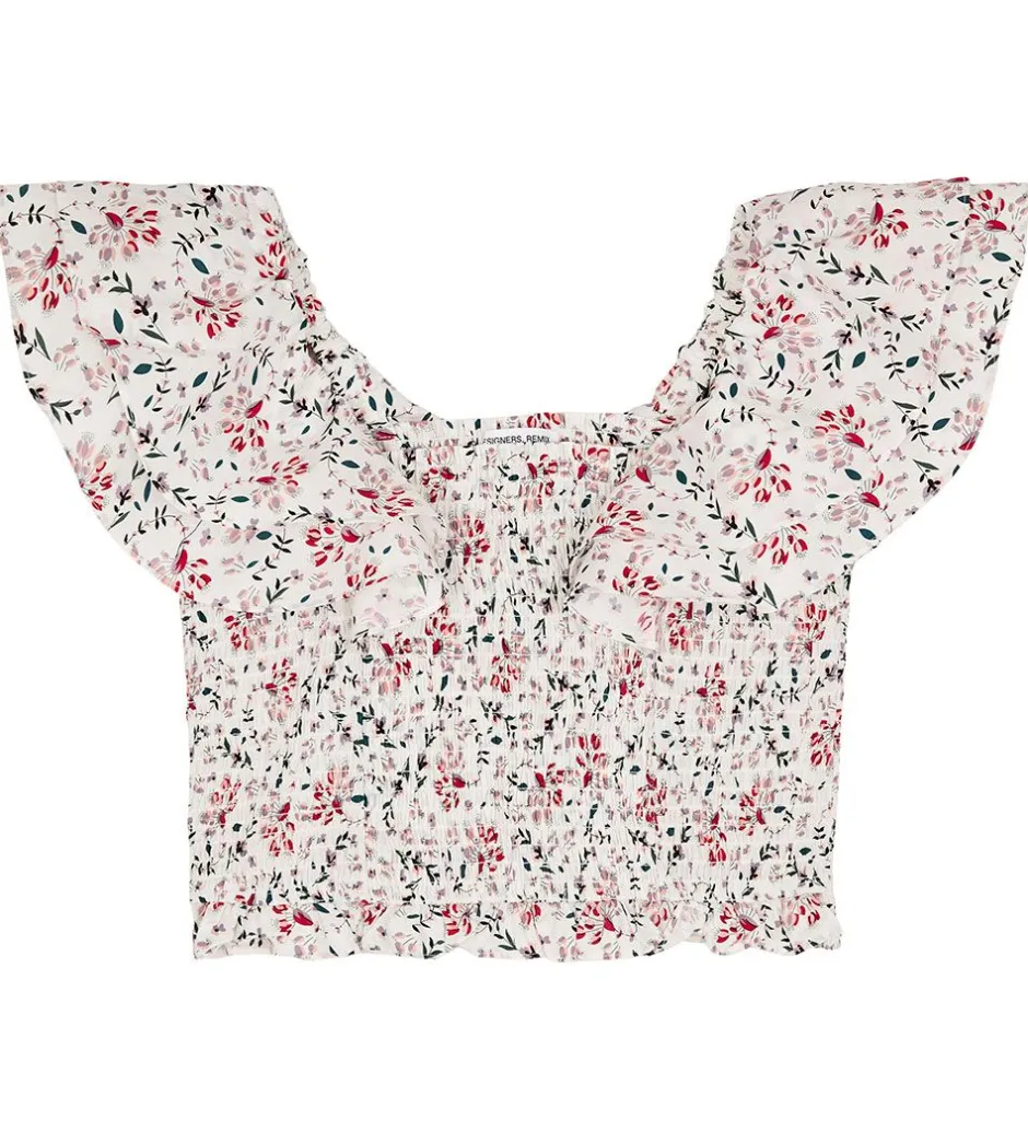 Designers Remix toppen er kort og har brede elastikker over skuldrene med skønne flæser, som giver et unikt look. Toppen er i smock-elastik, hvor der også er en smal flæse i bunden.