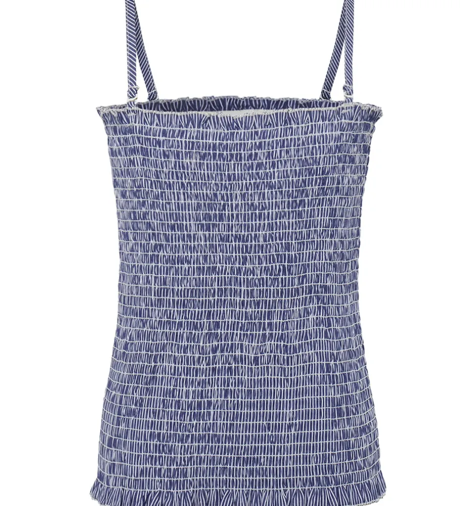 Grunt toppen er uden ærmer og den har smalle, justerbare skulderstropper, som kan tages af. Øverst er der elastik med silikone, så toppen bliver siddende, hvor den skal. Toppen er i en flot smock struktur, og den er produceret i en blød og strækbar kvalitet.