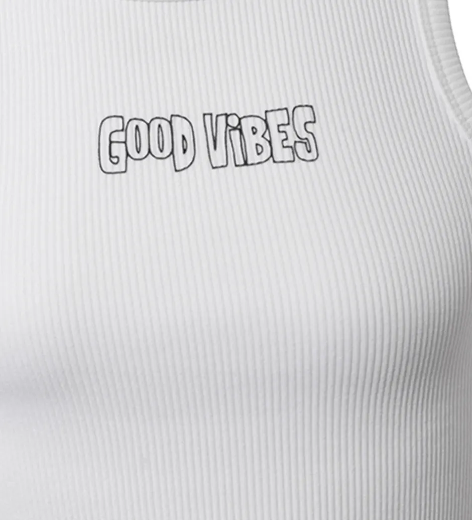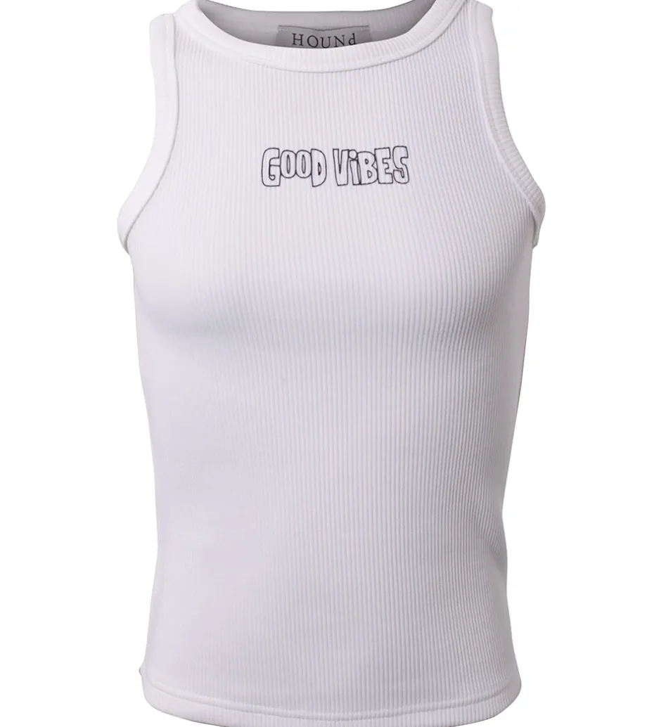 Smart Hound tanktop i hvid med et cool “GOOD VIBES” print på fronten i sort. Denne tanktop har en flot ribstruktur og er perfekt til varme dage.