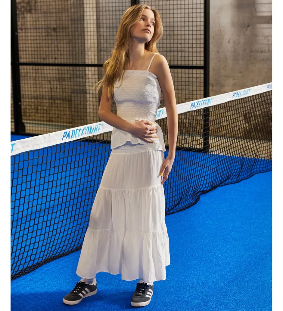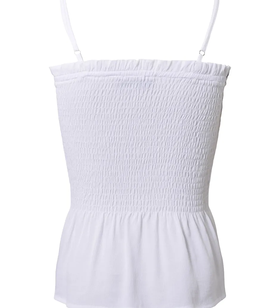 Hound toppen består af en bred smock syning med en flot, bred flæsekant nederst. Toppen er uden ærmer, og den har smalle, justerbare skulderstropper.