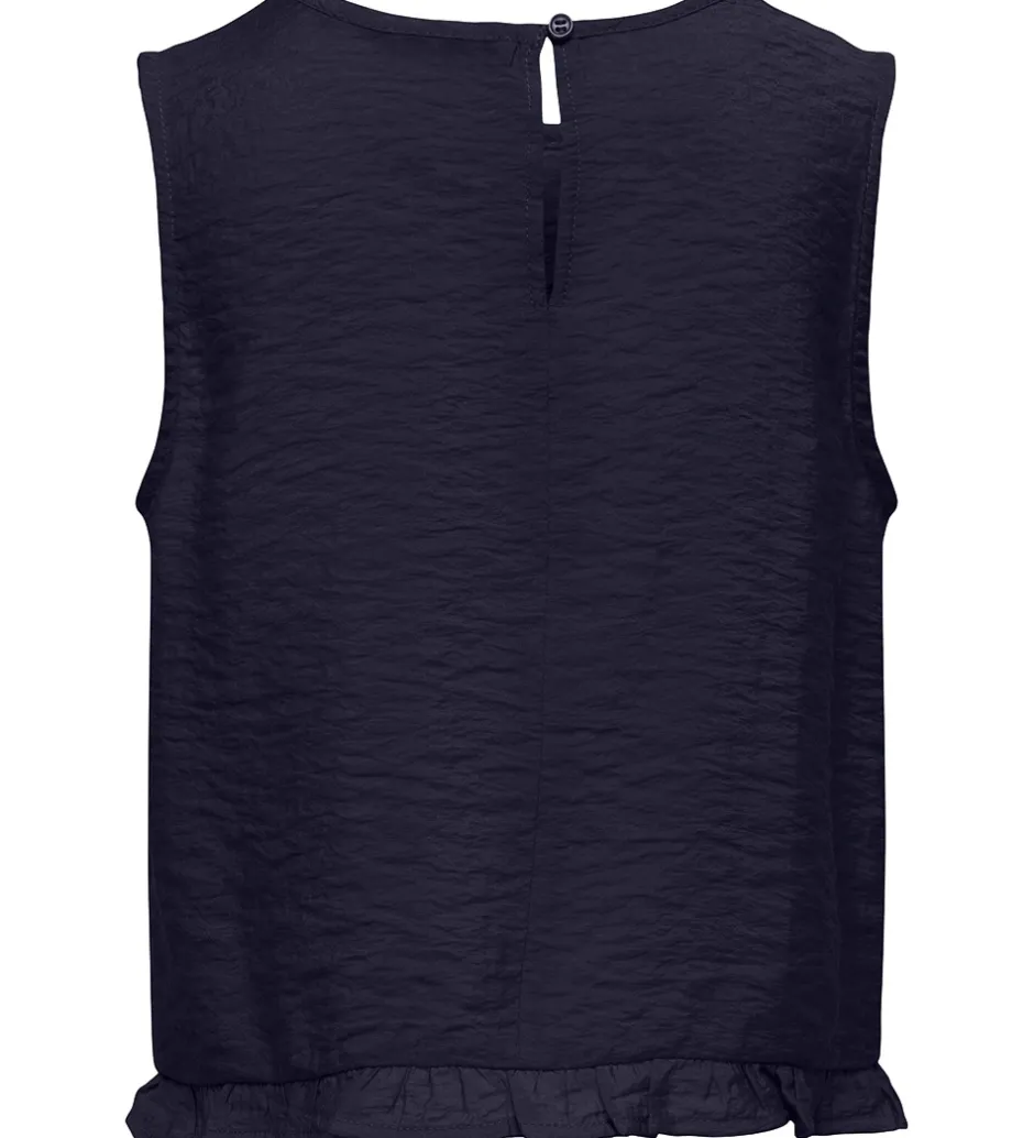 Kids Only toppen er uden ærmer og har brede skulderstropper. I bunden af toppen er der en smal flæsekant, og toppen kan åbnes i nakken med en knap i en dråbeform.