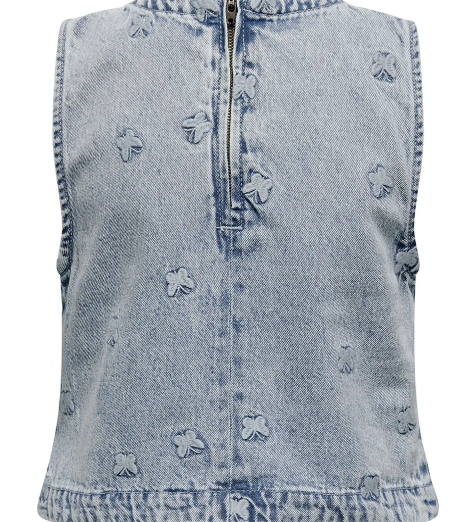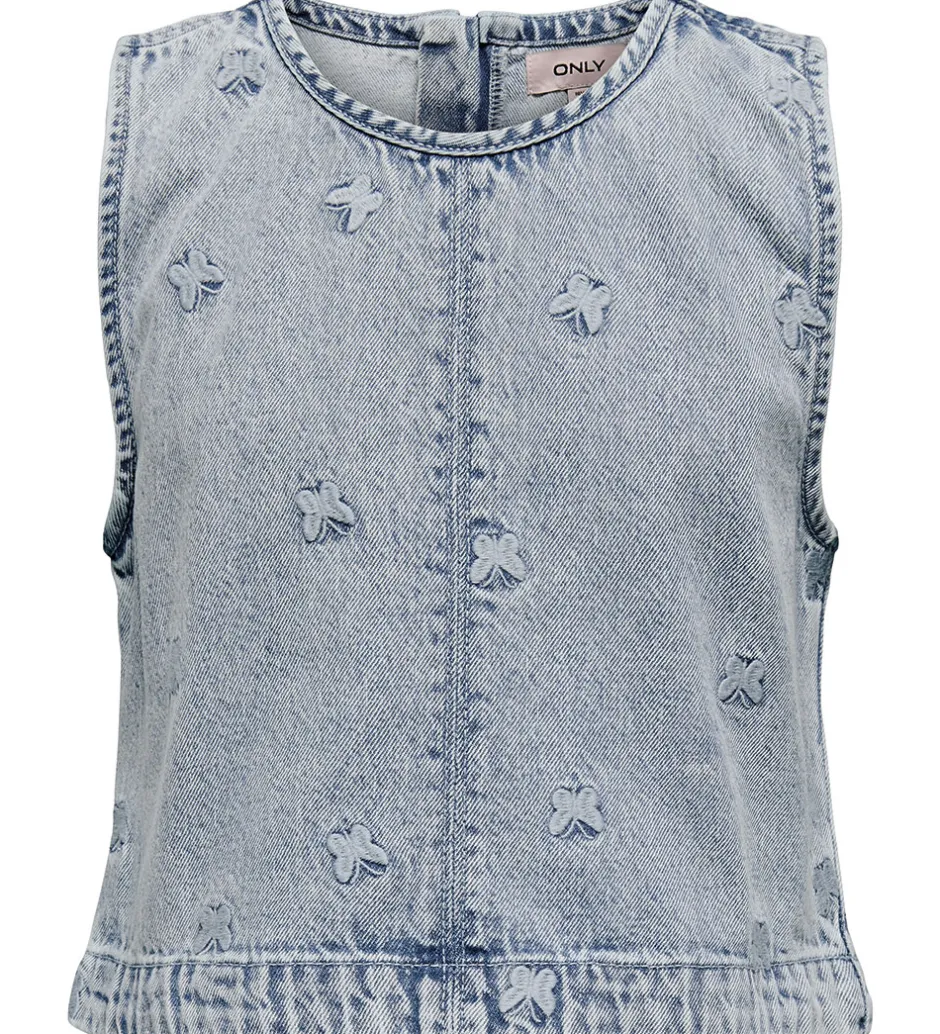 Stilfuld Only top i en lys, denimblå nuance. Toppen prydes af små, broderede sommerfugle, hvilket tilføjer et charmerende udtryk. Only toppen har en ærmeløs pasform med en rund halsudskæring.