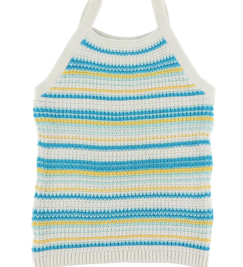 Skøn Kids Only top i stribet strukturstrik i farverne beige, gul og tukis.