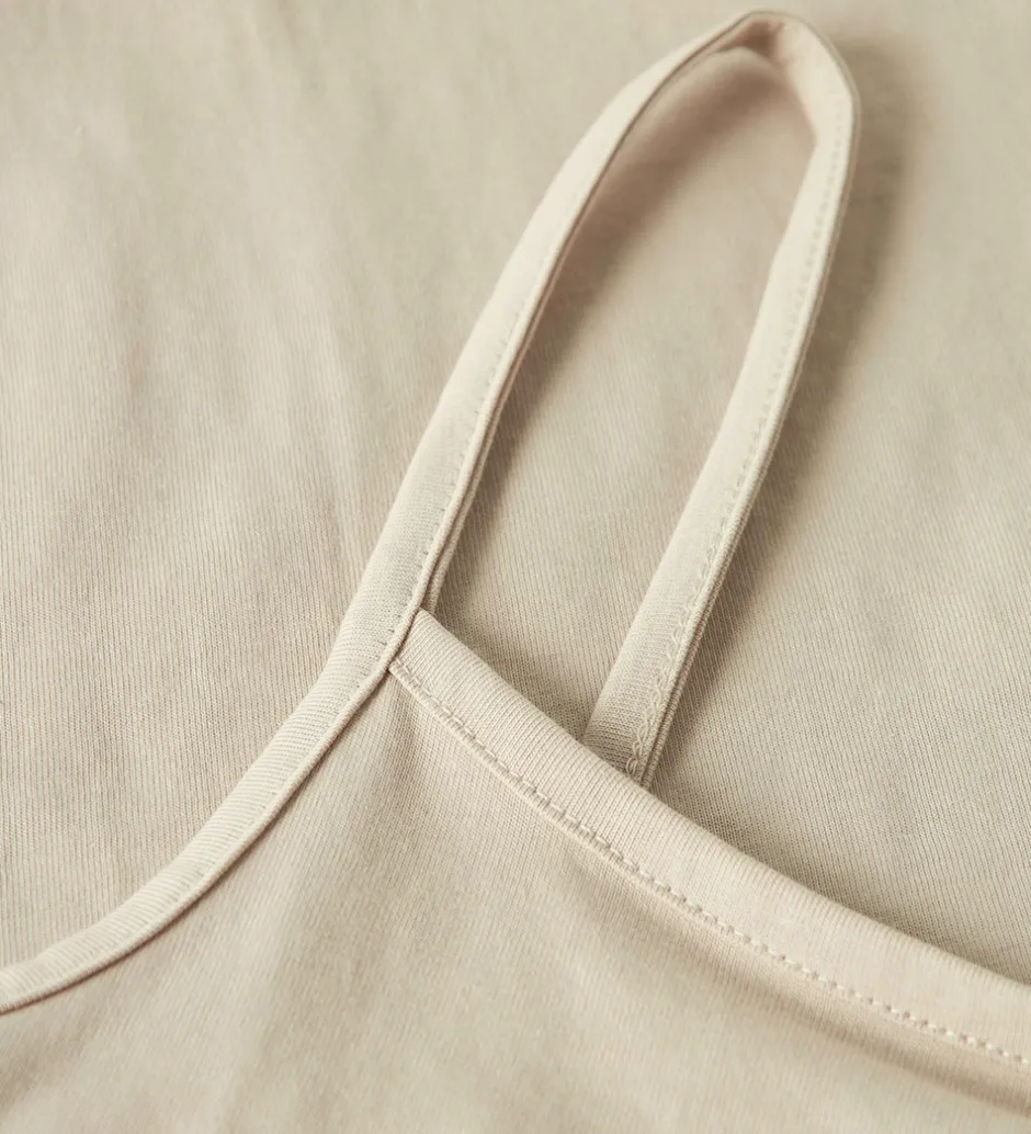 Elegant LMTD top i en neutral, beige farve. Toppen har tynde stropper og en diskret, rund halsudskæring. LMTD toppen er enkel og stilren uden yderligere mønster eller print, hvilket giver den et alsidigt udtryk.