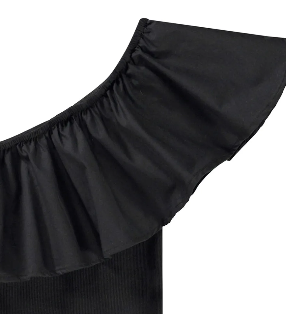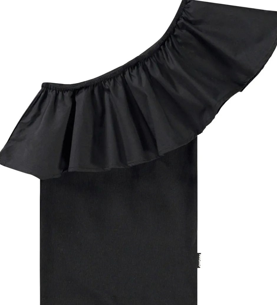 Elegant Molo top i ensfarvet sort med en fin ribstruktur samt dekorativ flæsekant.