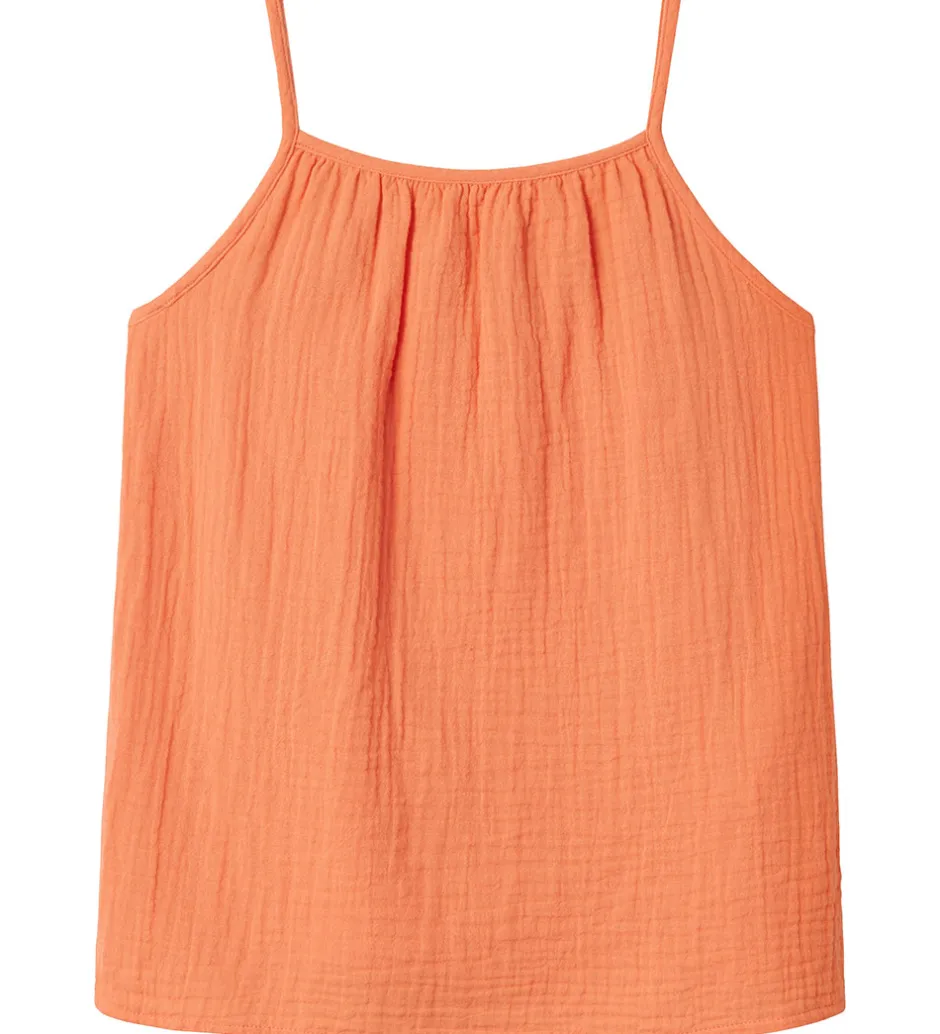 Dejlig Name It top i en varm, orange farve med musselin struktur. Name It toppen har tynde stropper, der giver en let og luftig følelse, perfekt til varme dage.