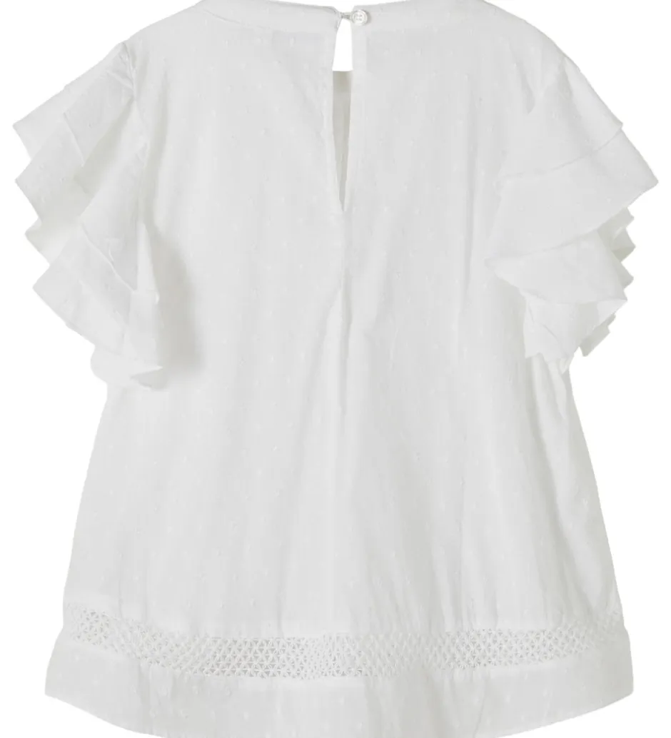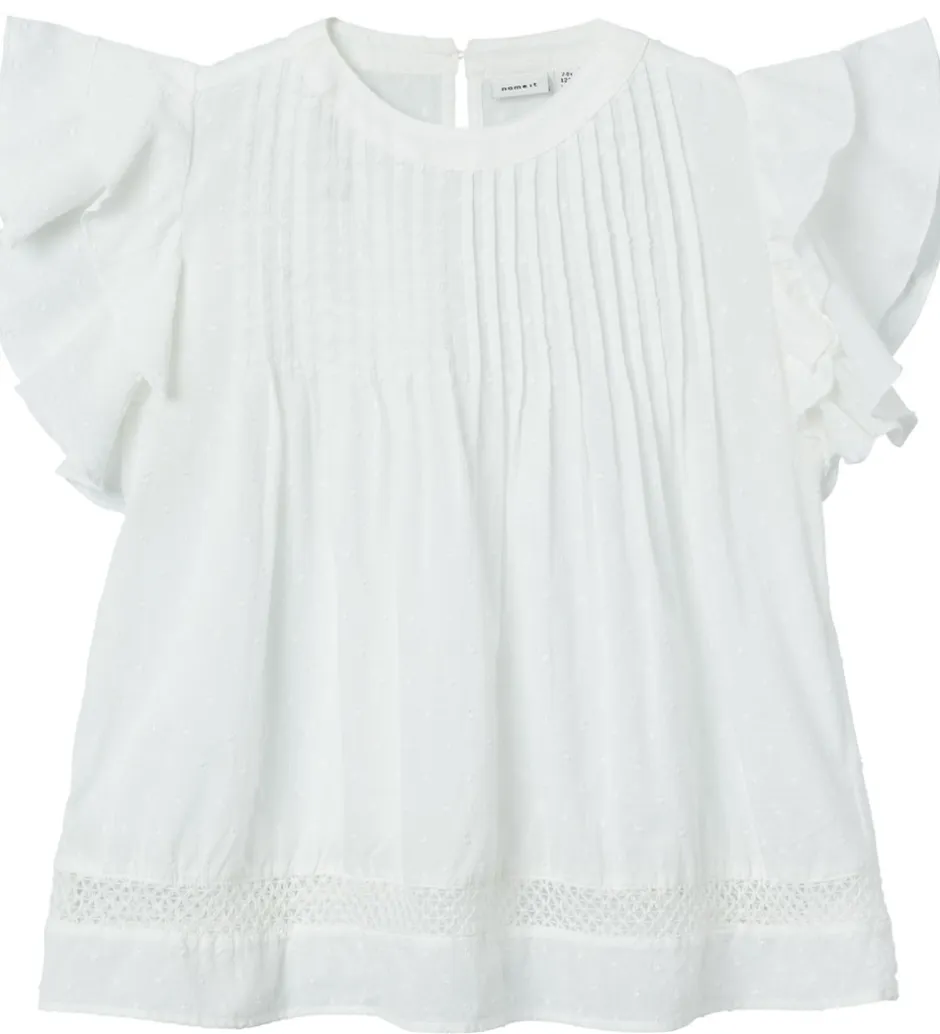 Name It toppen er uden ærmer, og den har fine flæser omkring skuldrene. Den har fine syninger på brystet, så den får fine rynker. Toppen åbnes i nakken med en knap i en dråbeform. Toppen er lavet i en blød og behagelig bomuldskvalitet.