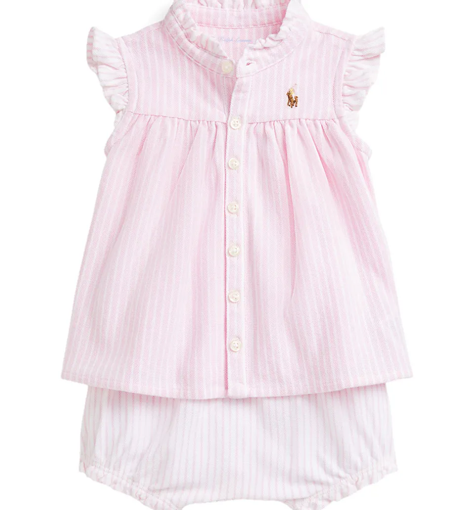 Fint Polo Ralph Lauren sæt, der består af en top og et par bloomers. Toppener rosa med smalle, hvide striber, mens bloomerne er hvide med smalle, rosa striber.