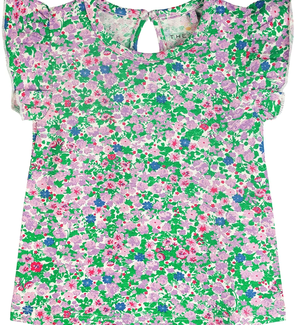Flot The New Siblings top med en råhvid bund og et allover blomsterprint i rosa, blå og grøn.