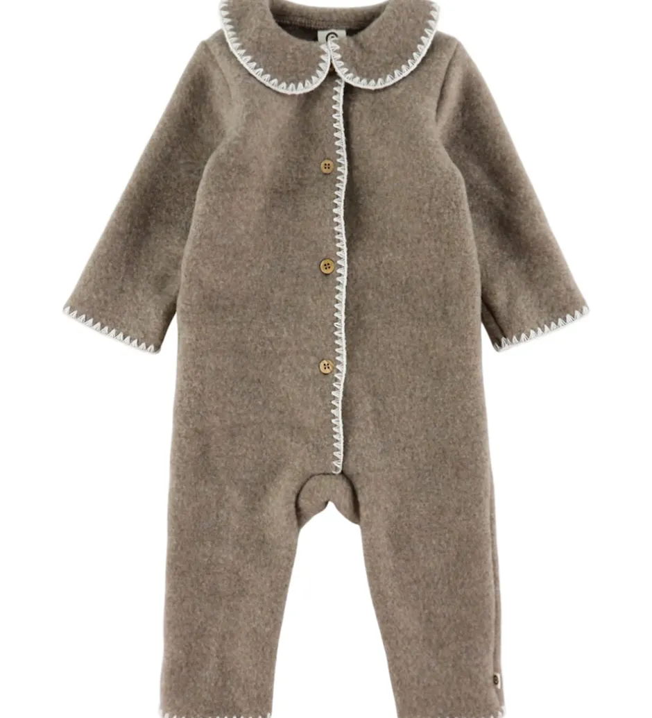 Elegant Müsli køredragt af uldfleece i en ensartet, meleret brun farve med dekorative syninger langs kanterne.