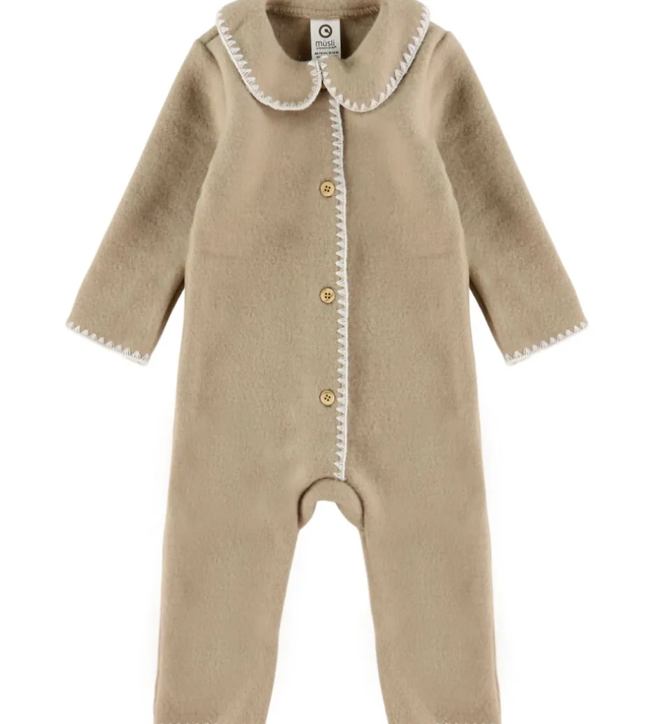 Elegant Müsli køredragt af uldfleece i en ensartet, beige farve med dekorative syninger langs kanterne.
