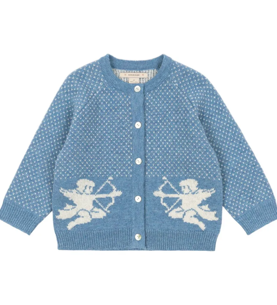 Bedårende Konges Sløjd cardigan i en blød blå nuance med elegante, hvide mønstre med fine prikker. Cardiganen har unikke motiver af bueskydende engle nederst, som tilføjer et særegent udtryk. Med praktiske knapper i fronten sikres let åbning og lukning. Den runde hals og afslappede pasform giver et behageligt udtryk. Konges Sløjd har skabt et stilrent design. Cardiganen er lavet i en strikket kvalitet i en blød uldblanding.