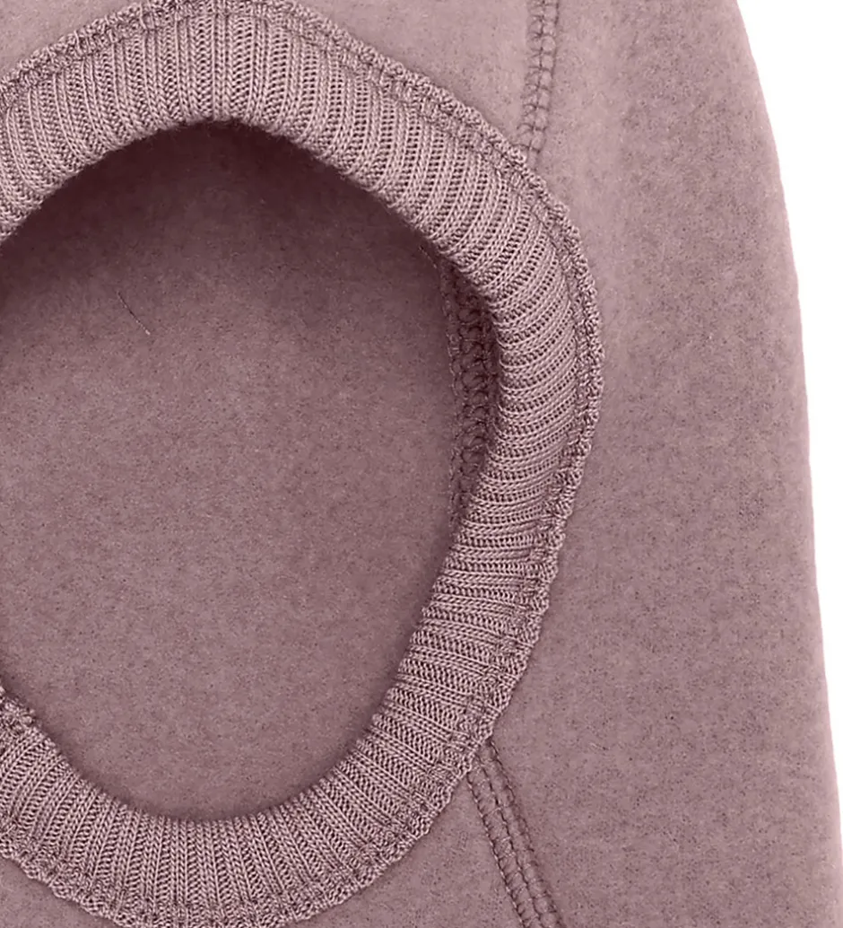 Fin Mikk-Line elefanthue af filtet merinould i mørk, støvet lilla. Elefanthuen har nuttede kaninører på toppen, og under hagen er der et brunt lædermærke med et Mikk-Line-logo.