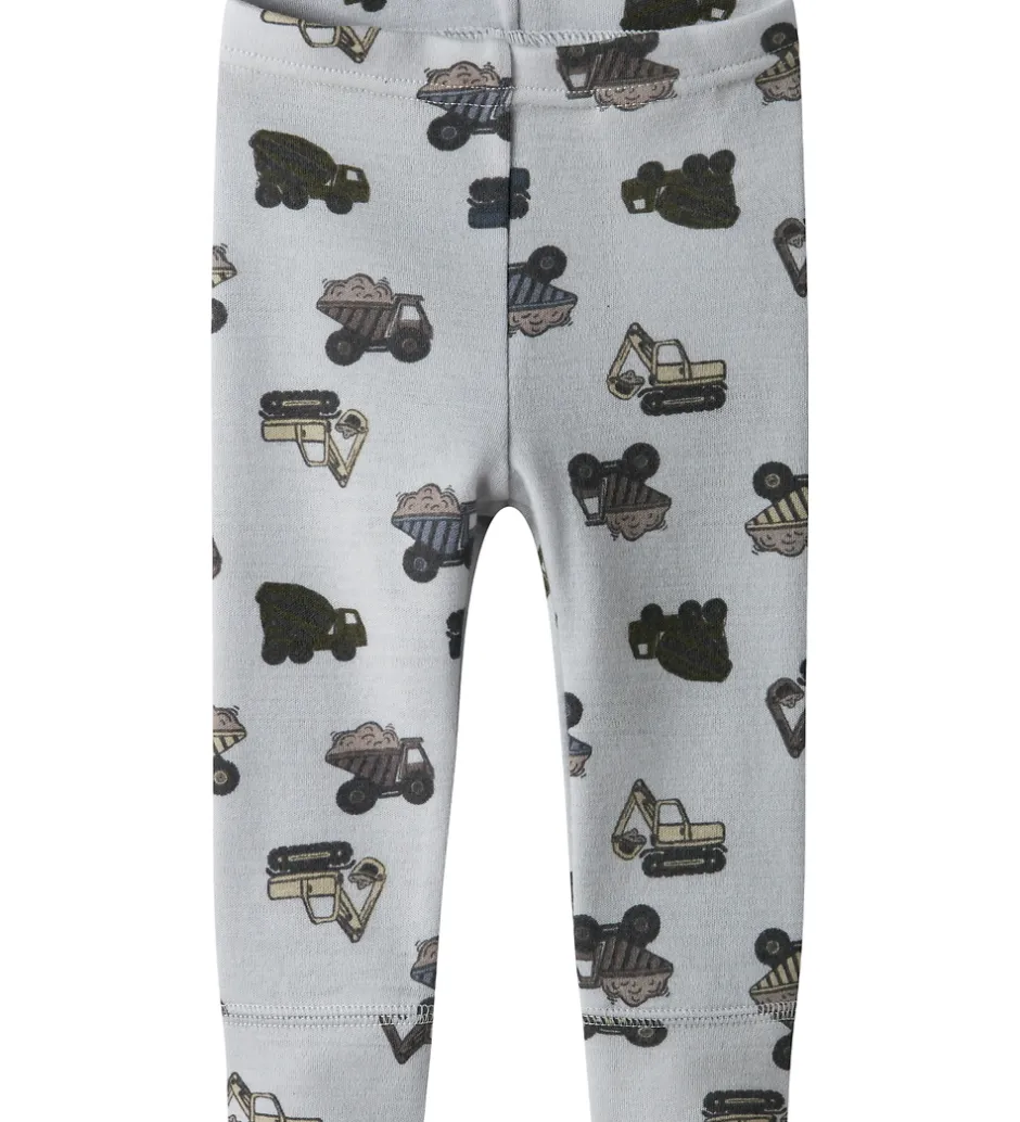 Skønne Name It leggings i lyseblå med alloverprint af arbejdsmaskiner. Name It leggingsene har elastik i taljen, og brede kanter ved anklerne, som sikrer en god pasform. Legginsene er fremstillet af merinould.