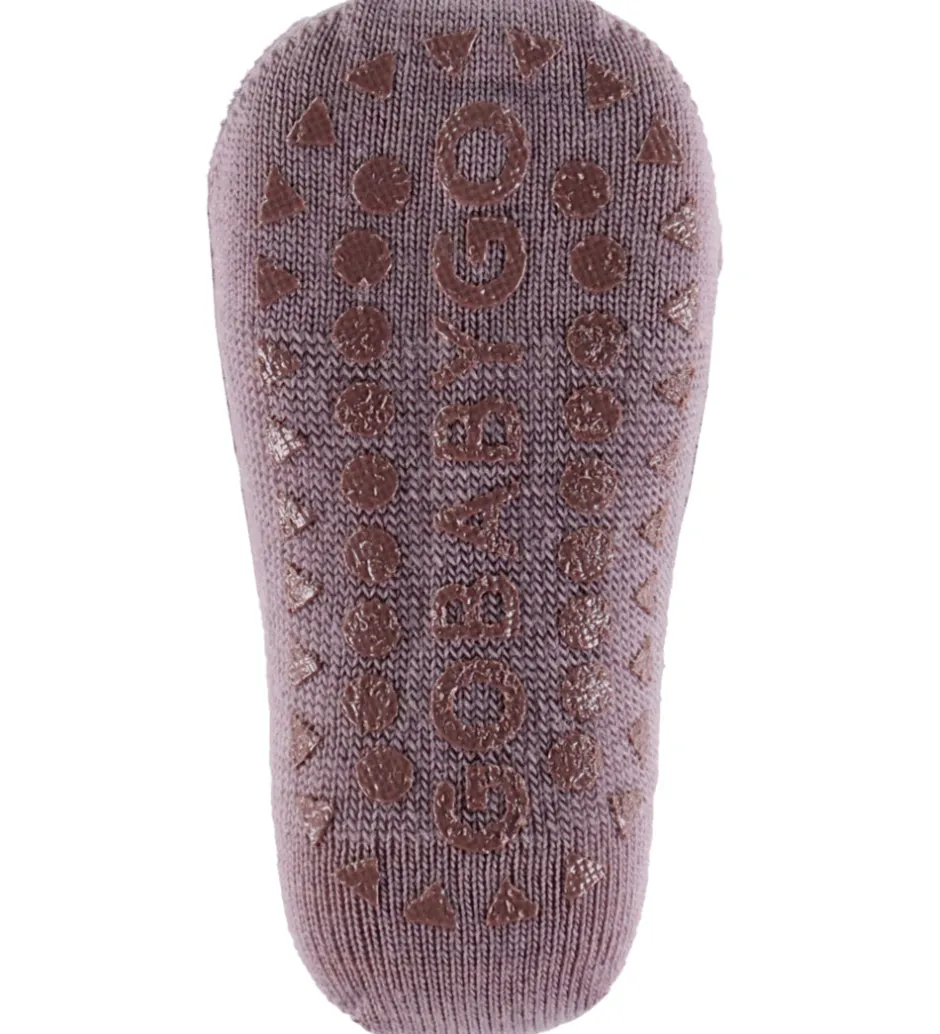Søde GoBabyGo kravlestrømpebukser i lilla, og de har gummidutter på og under foden samt på knæene.