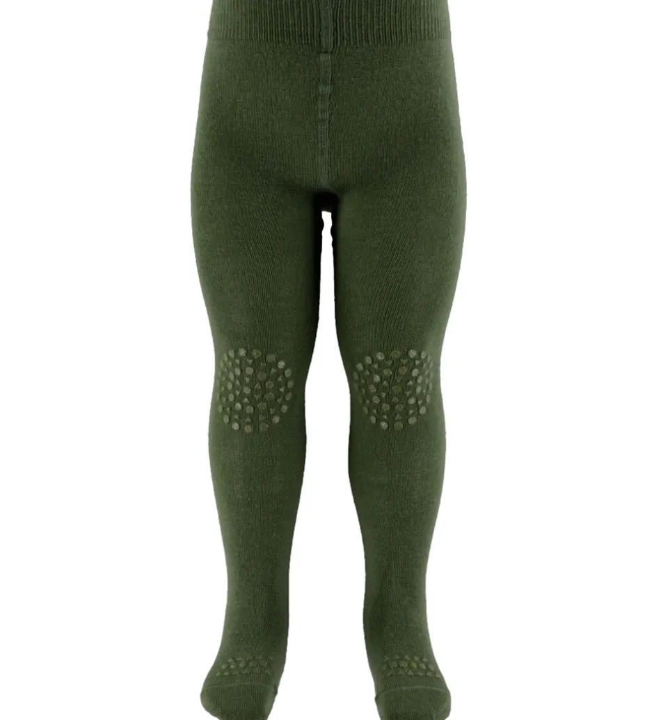 Smarte GoBabyGo kravlestrømpebukser i mørkegrøn, og de har gummidutter på og under foden samt på knæene.