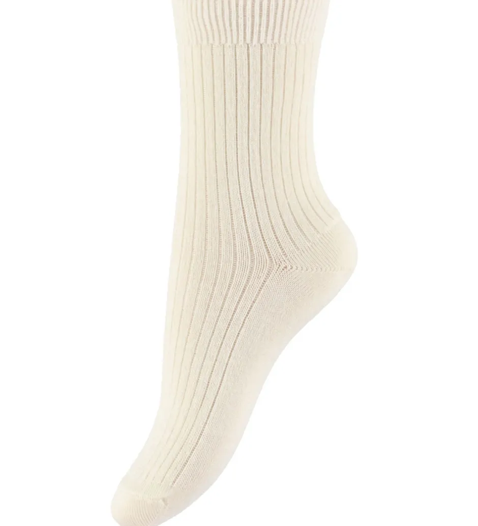 Elegante MP strømper i ensfarvet cremehvid. MP strømperne har et langt skaft med en smal ribkant øverst, der sikrer en god pasform. Strukturen er præget af lodrette ribber, som giver en klassisk og tidløs stil.
