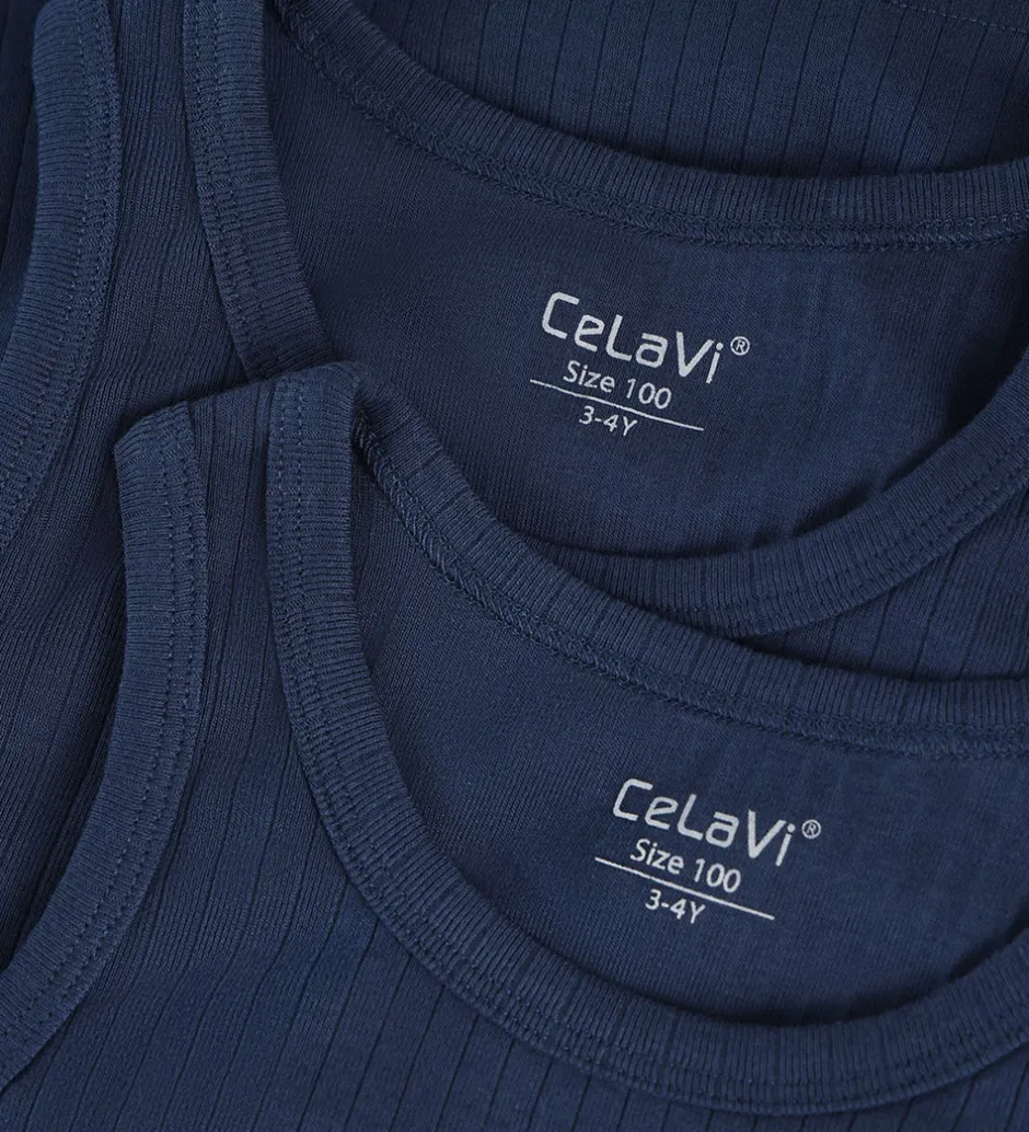 Smarte CeLaVi undertrøjer solgt i en 2-pak i ensfarvet mørkeblå med ribstruktur. Undertrøjerne har brede skulderstropper og er fremstillet i en blød kvalitet.