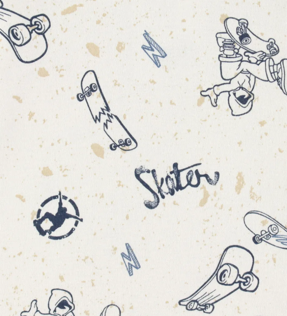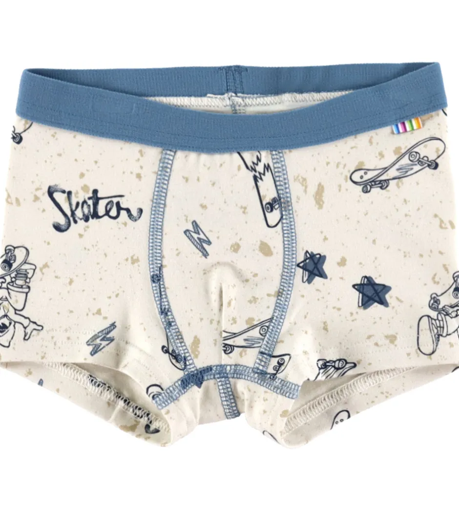 Flotte Joha boxershorts i beige og blå med et skater-print. Boxershortsene har en lyseblå elastikkant, der giver en behagelig pasform.