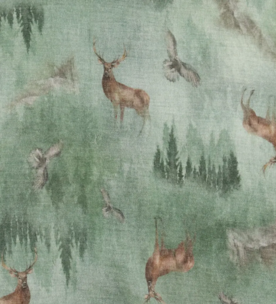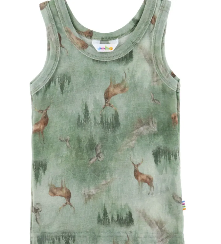 Herlig Joha undertrøje med bredde stropper. Undertrøjen har et skovmotiv i grønne nuancer med dyreprint af hjorte og fugle. Undertrøjen fra Joha har en blød og behagelig struktur.