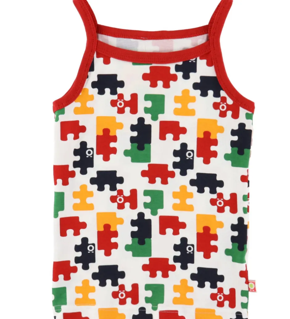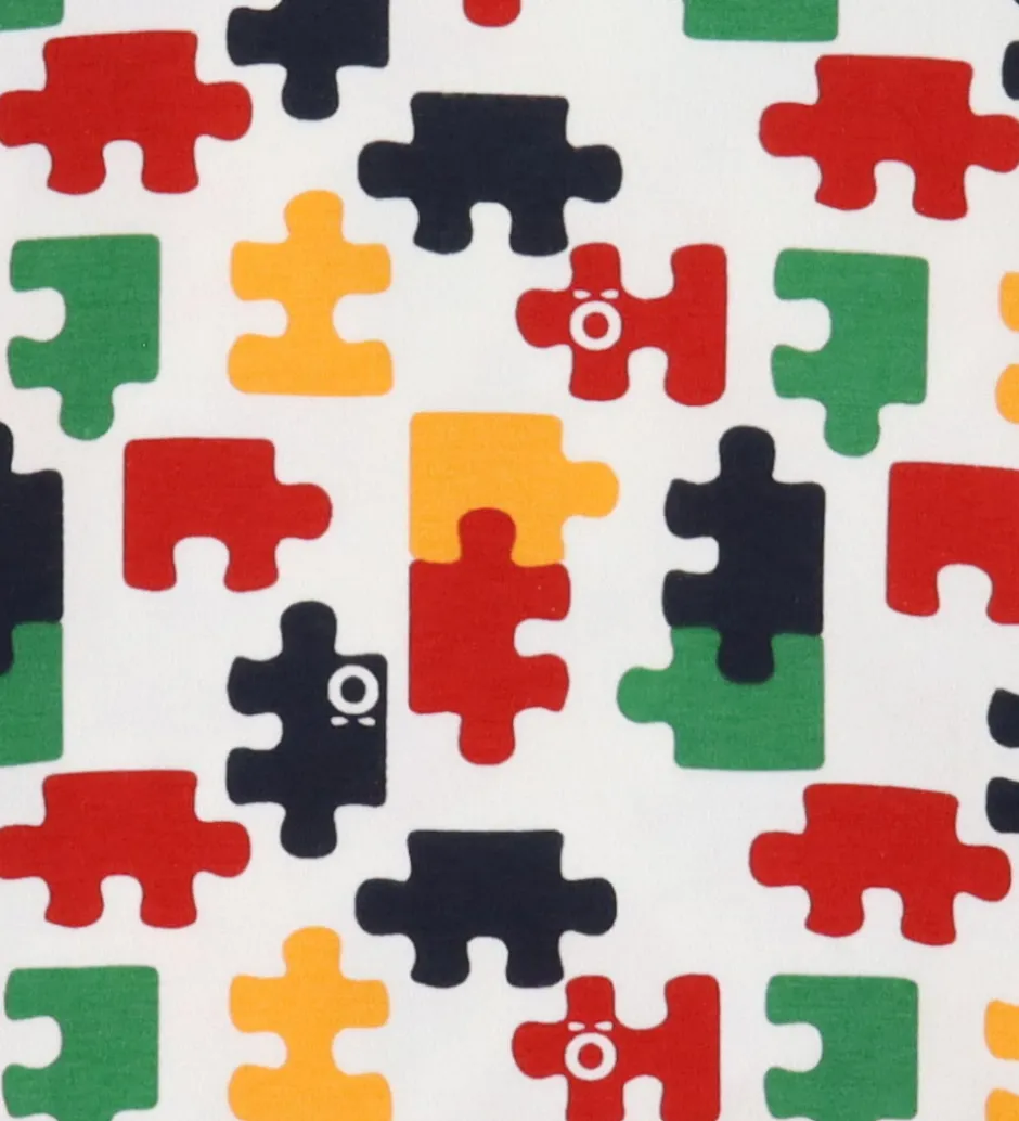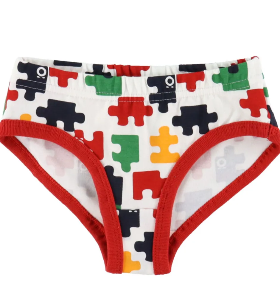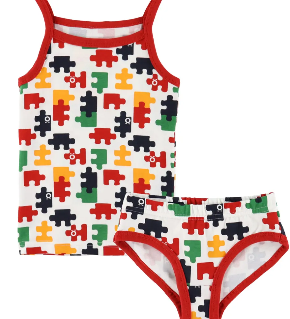 Smart Katvig undertøj bestående af en undertrøje og et par trusser i hvid med print af farverige puslespilsbrikker og med røde kanter.